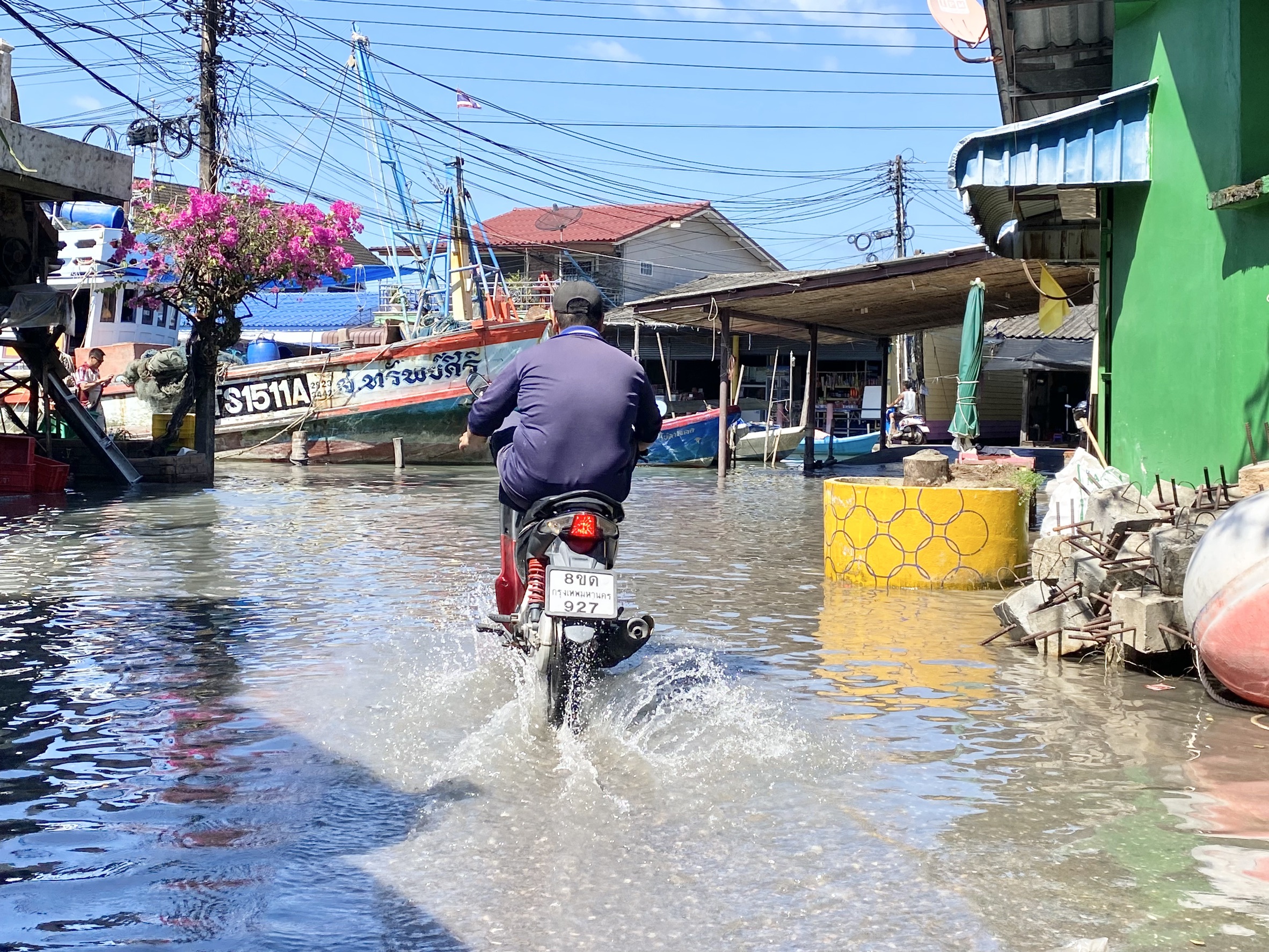 เส้นทางสัญจรหลายสายถูกน้ำท่วมจนรถและประชาชนต้องลุยน้ำเค็มเพื่อเดินทาง