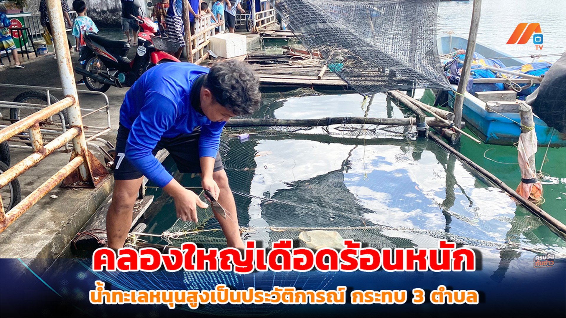 ปลาหลุดออกจากกระชังจำนวนมาก ทำให้เกษตรกรต้องรีบปิดตาข่ายด้านบนเพื่อป้องกันความเสียหายเพิ่มเติม