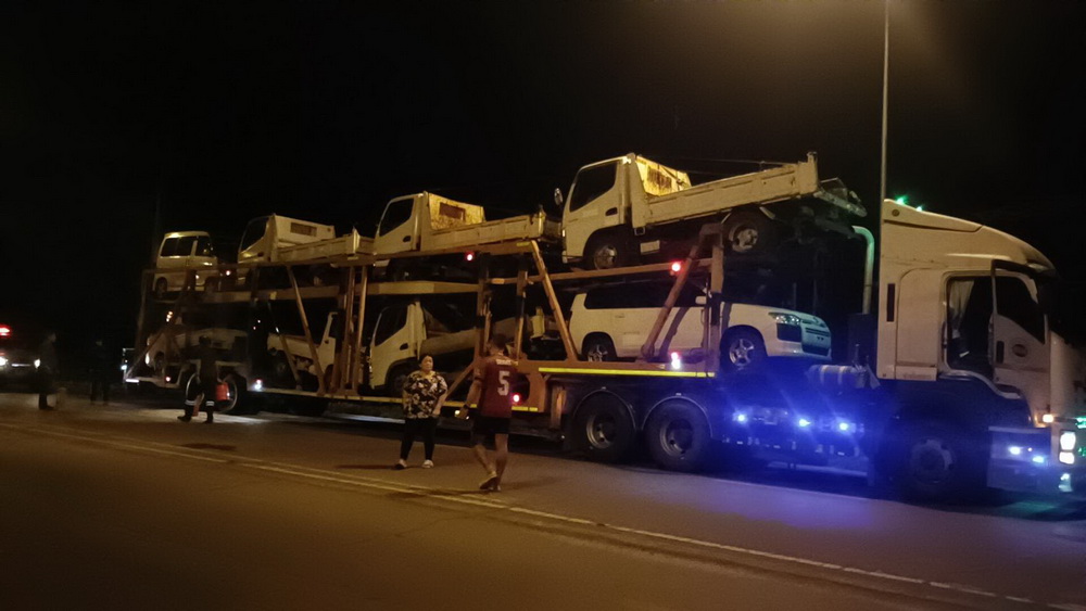 ศูนย์วิทยุ 191แม่ฮ่องสอนรับแจ้งเหตุเพลิงลุกไหม้ใต้ท้องรถบรรทุกพ่วงบรรทุกรถมือสอง