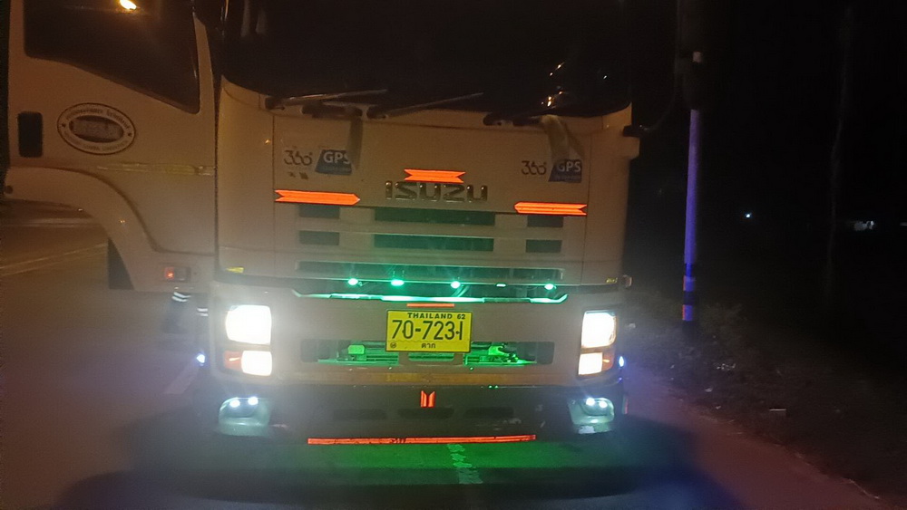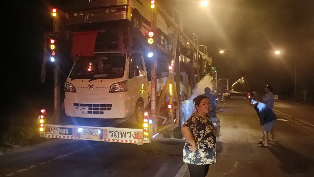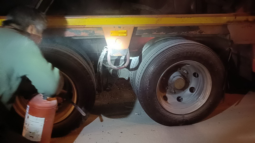 ที่เกิดเหตุพบรถบรรทุกพ่วงยี่ห้ออีซูซุ ทะเบียน 70-7231 ตาก มีกลุ่มควันพวยพุ่งใต้ท้องรถ
