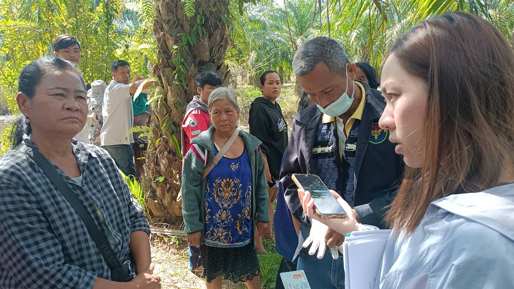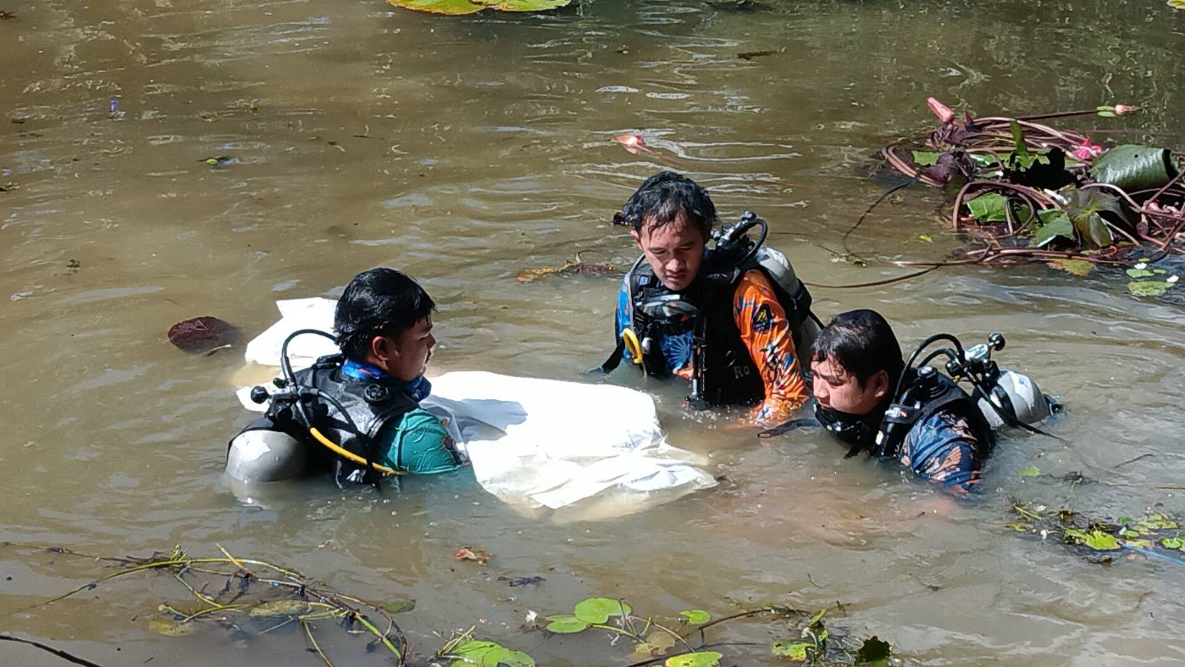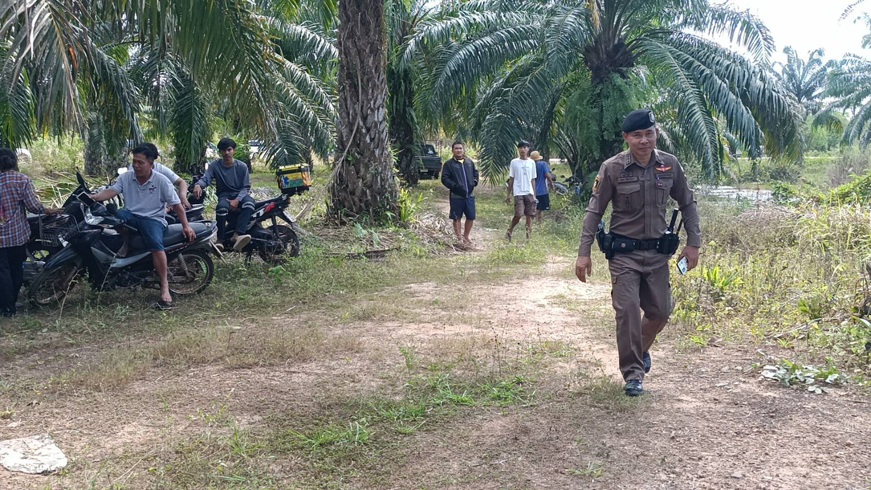 อาสาสมัครหน่วยกู้ภัยฯจัดชุดประดับน้ำค้นหาในคลองตามที่ได้รับแจ้ง เหตุที่เกิดเหตุเป็นคลองในสวนปาล์มของชาวบ้านรายหนึ่ง