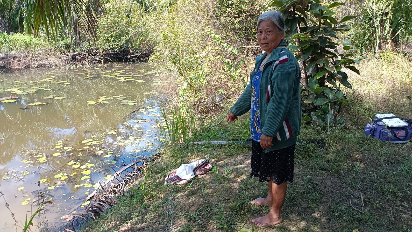 ลึก2เมตรกว้าง5 เมตร ยาว50เมตร ริมคลองมีผ้าขาวม้าลายสก๊อตสีแดงและเสื้อยืดแขนสั้นสีขาวกองอยู่