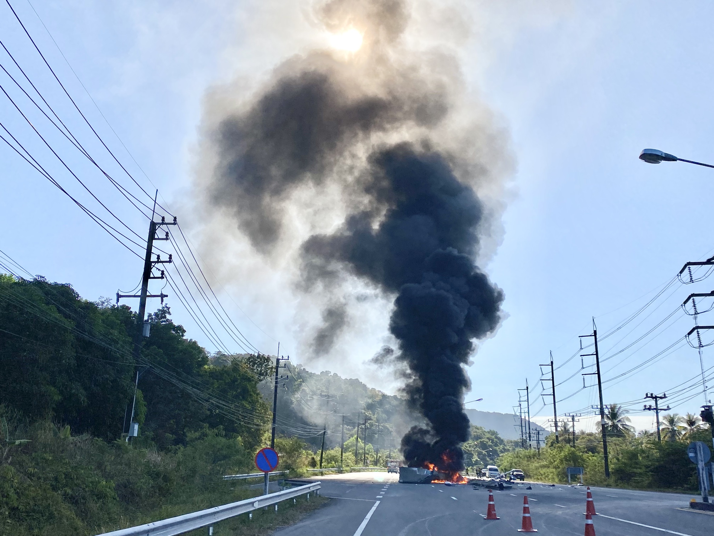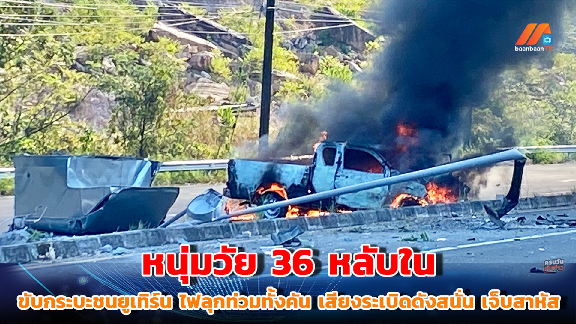 หนุ่มวัย 36 หลับในขับกระบะชนยูเทิร์น ไฟลุกท่วมทั้งคัน เสียงระเบิดดังสนั่น เจ็บสาหัส