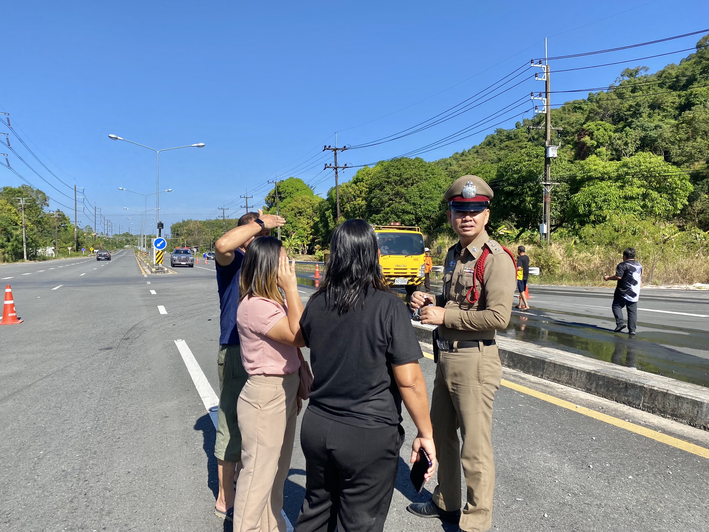 หลังเพลิงสงบ เจ้าหน้าที่ตำรวจและหน่วยกู้ภัยช่วยกันเก็บกวาดซากรถ เปิดเส้นทางการจราจร ตรวจสอบพบเสาไฟฟ้าเสียหาย 1 ต้น และป้ายจราจรเสียหาย 2 ป้าย
