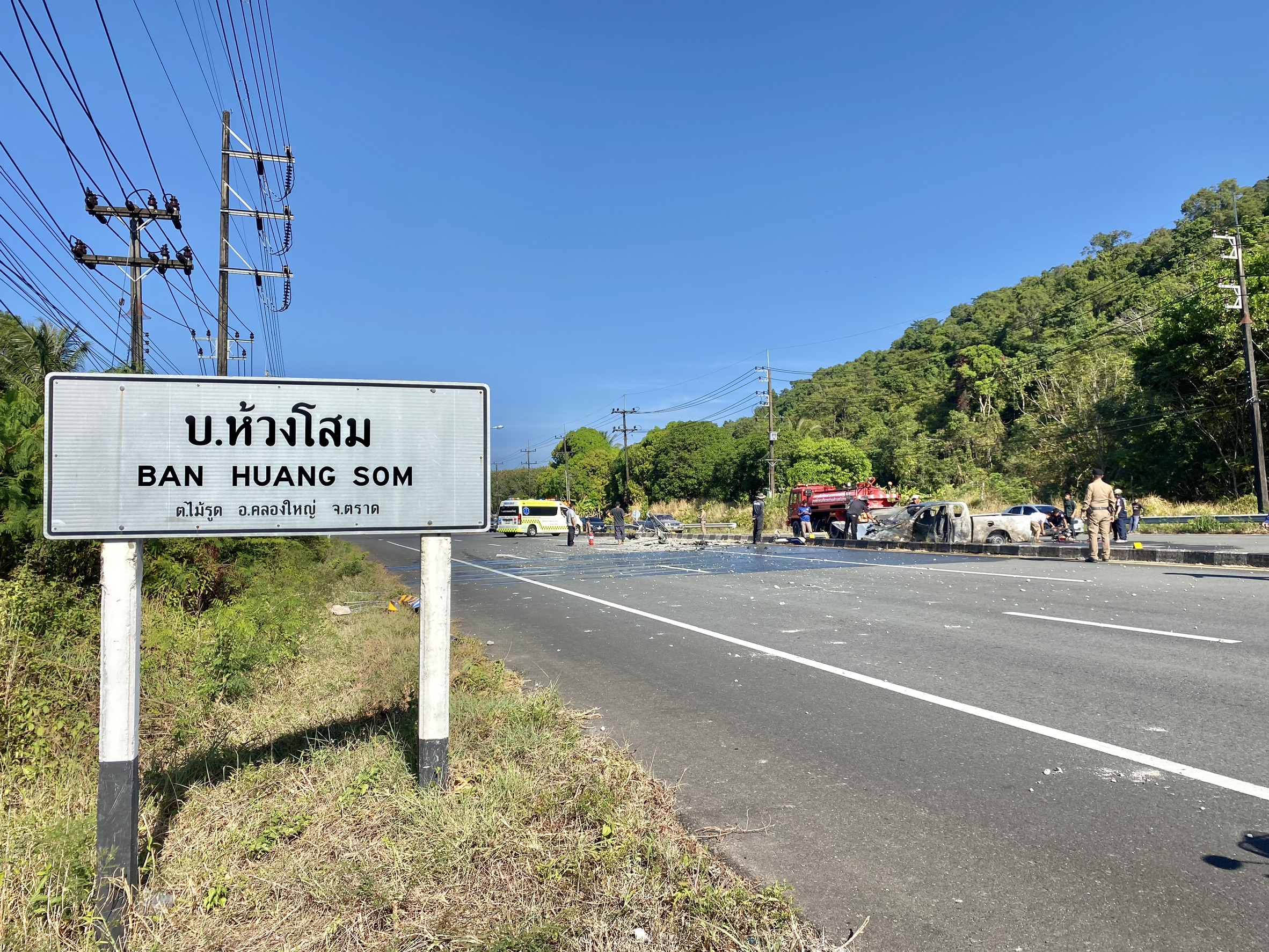 เกิดอุบัติเหตุรถกระบะพุ่งชนเกาะยูเทิร์นก่อนเกิดไฟลุกไหม้อย่างรุนแรง บนถนนสาย 3 บ้าน–ห้วงโสม หมู่ 3 ตำบลไม้รูด อำเภอคลองใหญ่ จังหวัดตราด