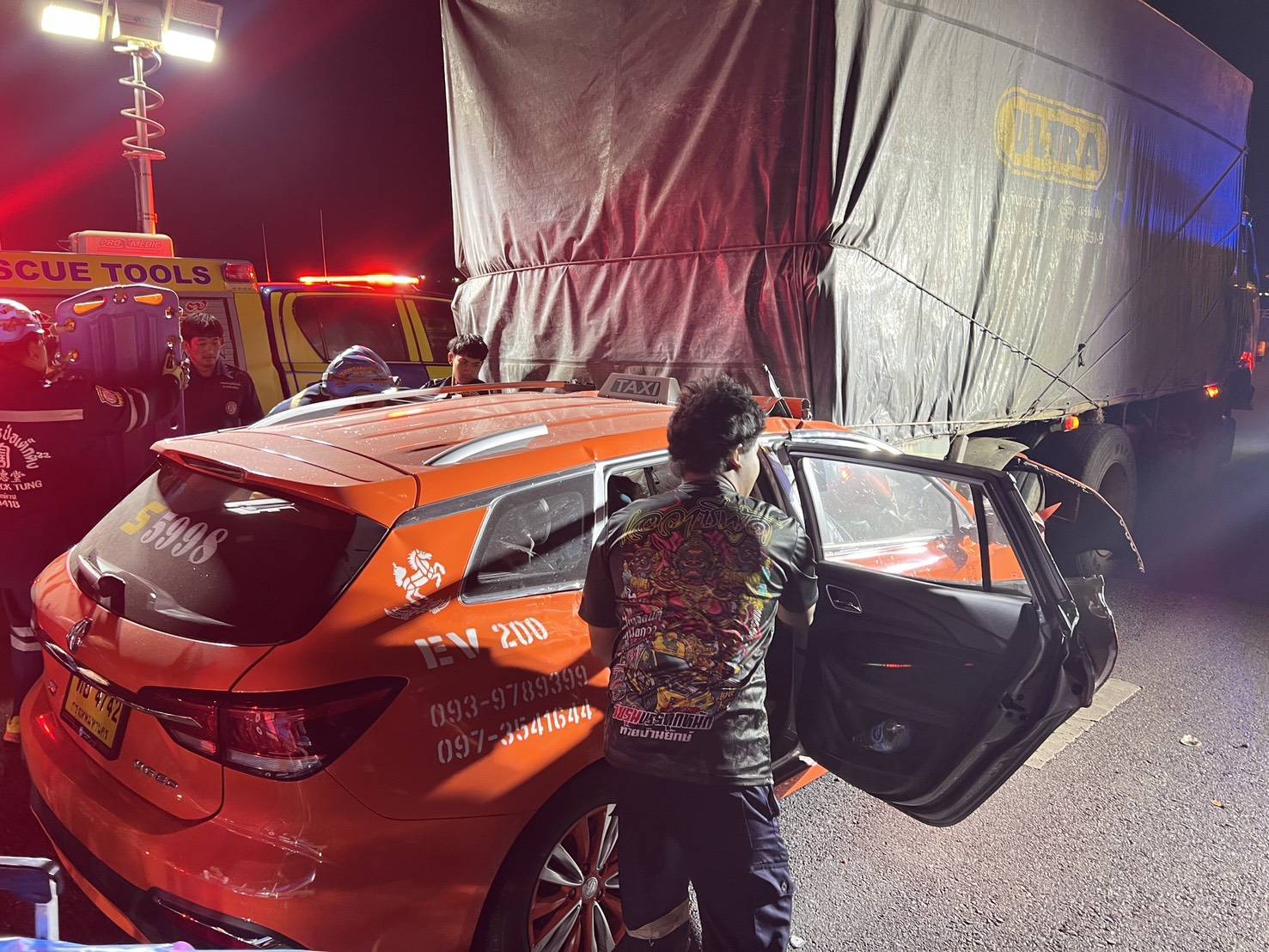 ที่เกิดเหตุพบรถแท็กซี่มิเตอร์ สีส้ม ชนท้ายรถบรรทุก 10 ล้ออย่างรุนแรง ภายในรถแท็กซี่พบผู้เสียชีวิต 3 ราย