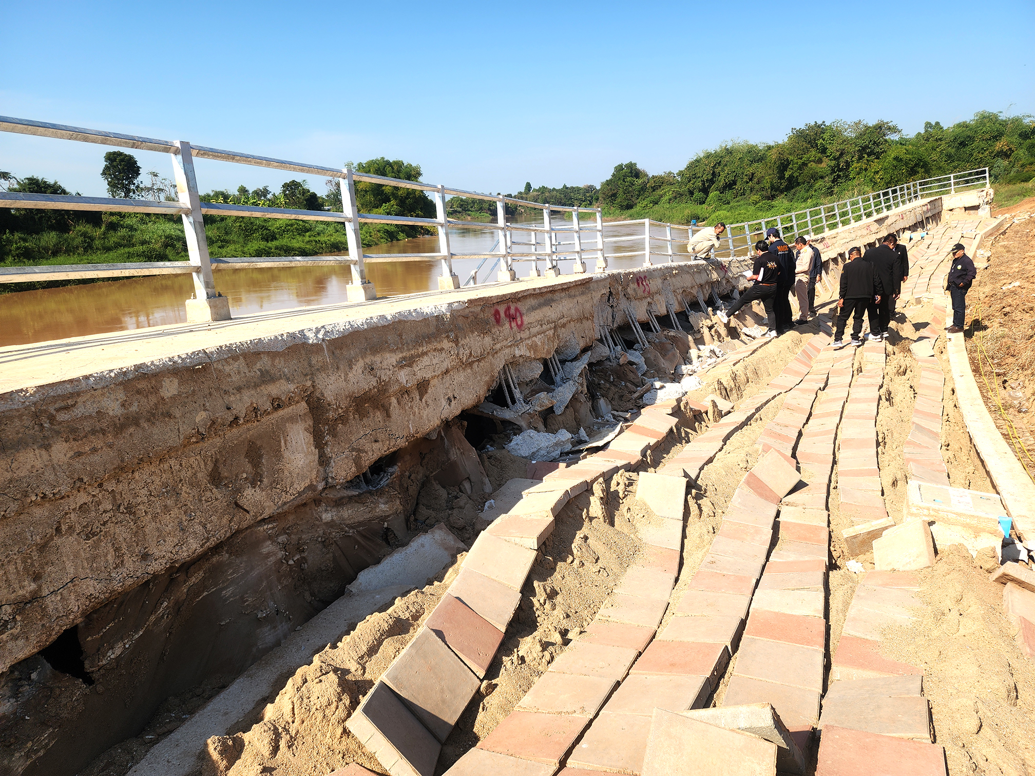 จากการตรวจสอบพบ เขื่อนความยาว 96 เมตร พังเสียหายถึง 49 เมตร โครงสร้างหลักเคลื่อนตัว เสาเข็มเอนแยกจากคาน