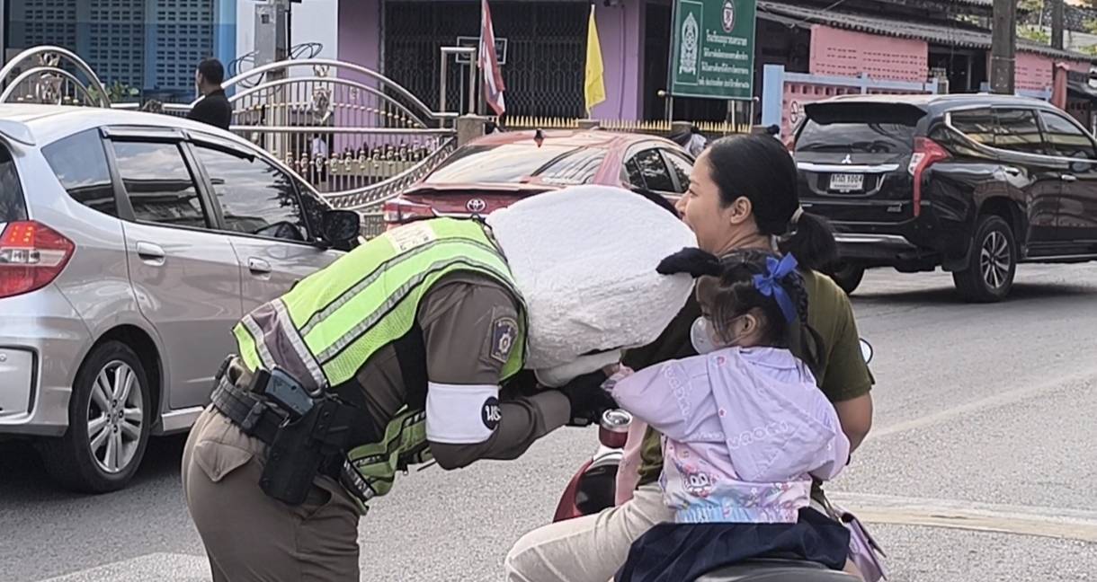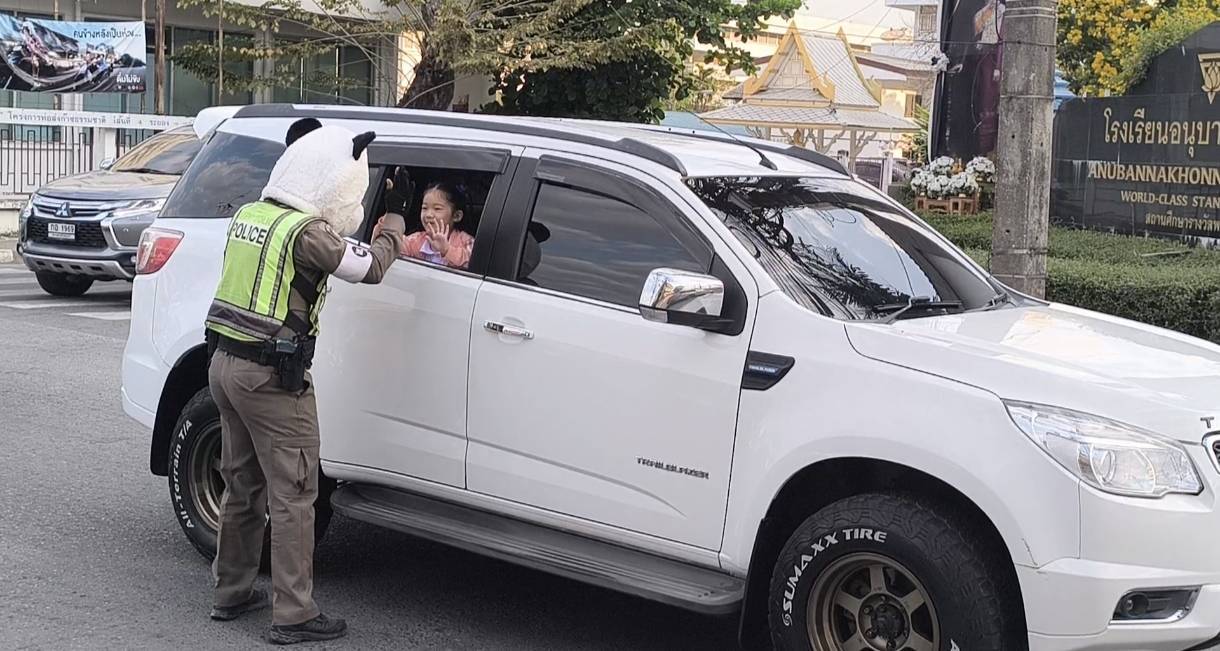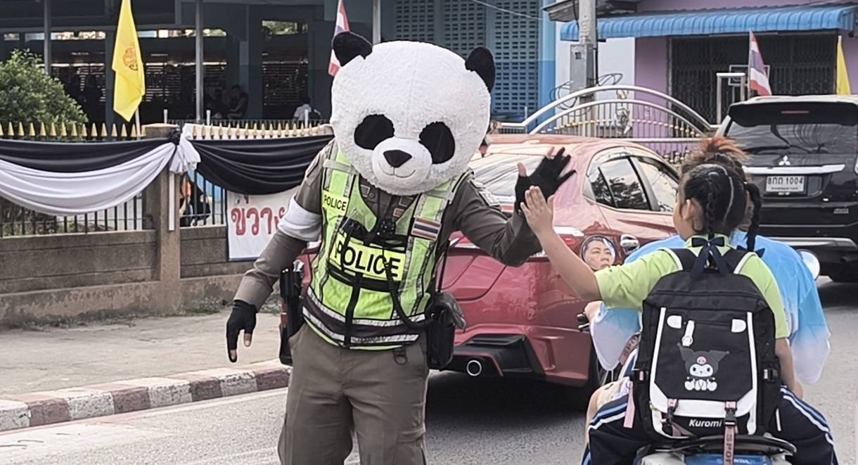 เต็มไปด้วยรอยยิ้มและเสียงหัวเราะ เมื่อเจ้าหน้าที่ตำรวจจราจรแต่งกายเป็นหมีแพนด้า ออกมาปฏิบัติหน้าที่โบกรถ สร้างสีสันและความประทับใจให้กับเด็กนักเรียนและผู้ปกครอง