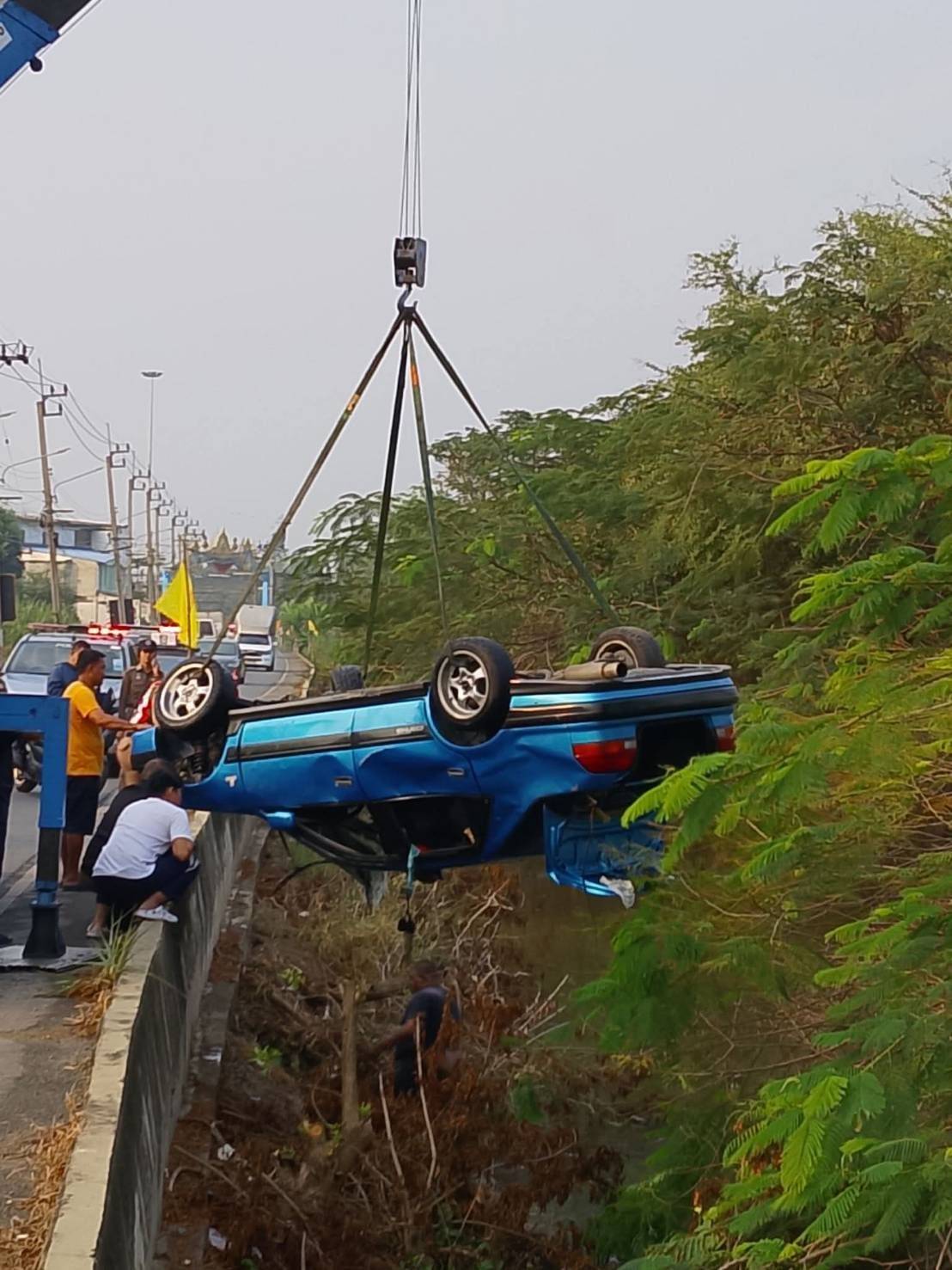 ที่เกิดเหตุพบรถเก๋ง Toyota สีฟ้า ทะเบียน 2 กค 3089 จมอยู่ในคลอง