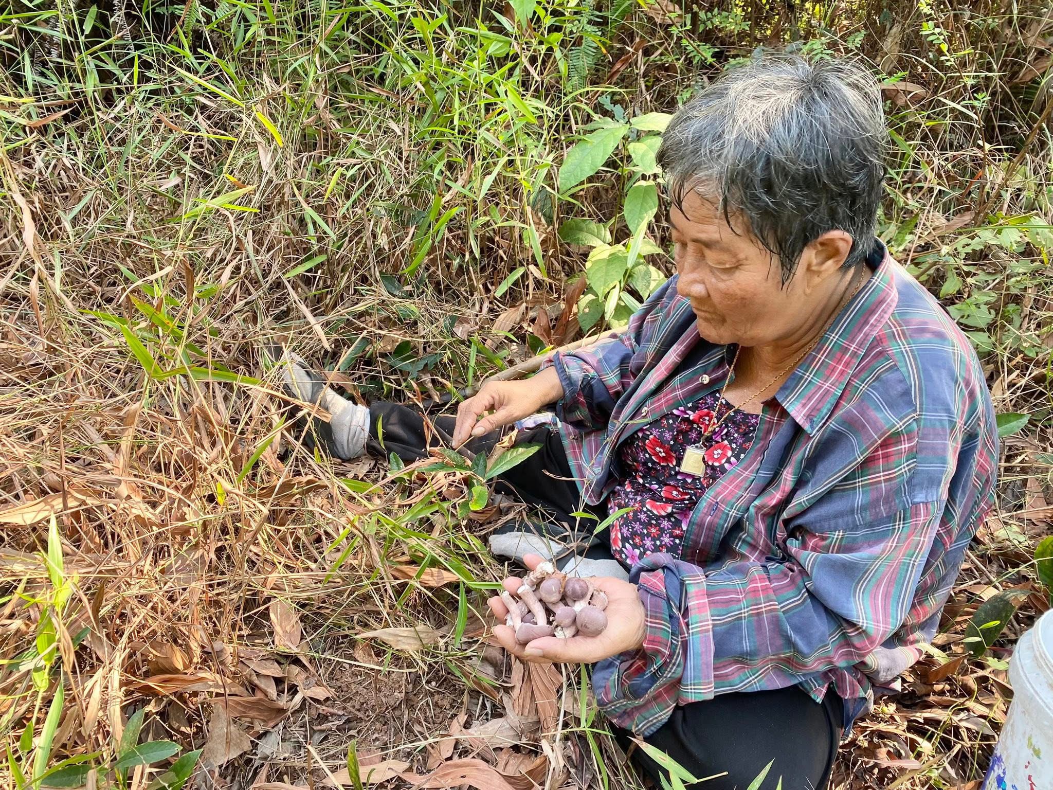 หลังทราบข่าวจากเพื่อนบ้านว่าเห็ดเริ่มออก จึงชวนครอบครัวเข้าป่าเก็บเห็ดเพื่อนำมาประกอบอาหารและจำหน่าย
