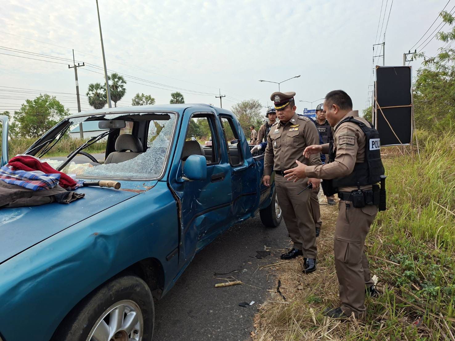 ระหว่างการติดตาม บริเวณปั๊มน้ำมันบางจาก เจ้าหน้าที่ใช้รถยนต์สายตรวจชนสกัดเพื่อหยุดยั้งการหลบหนี