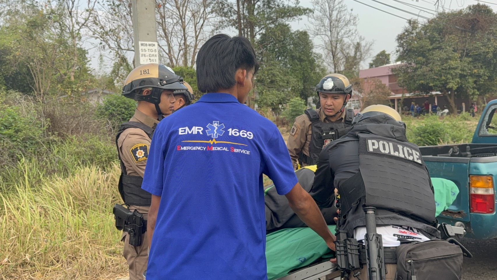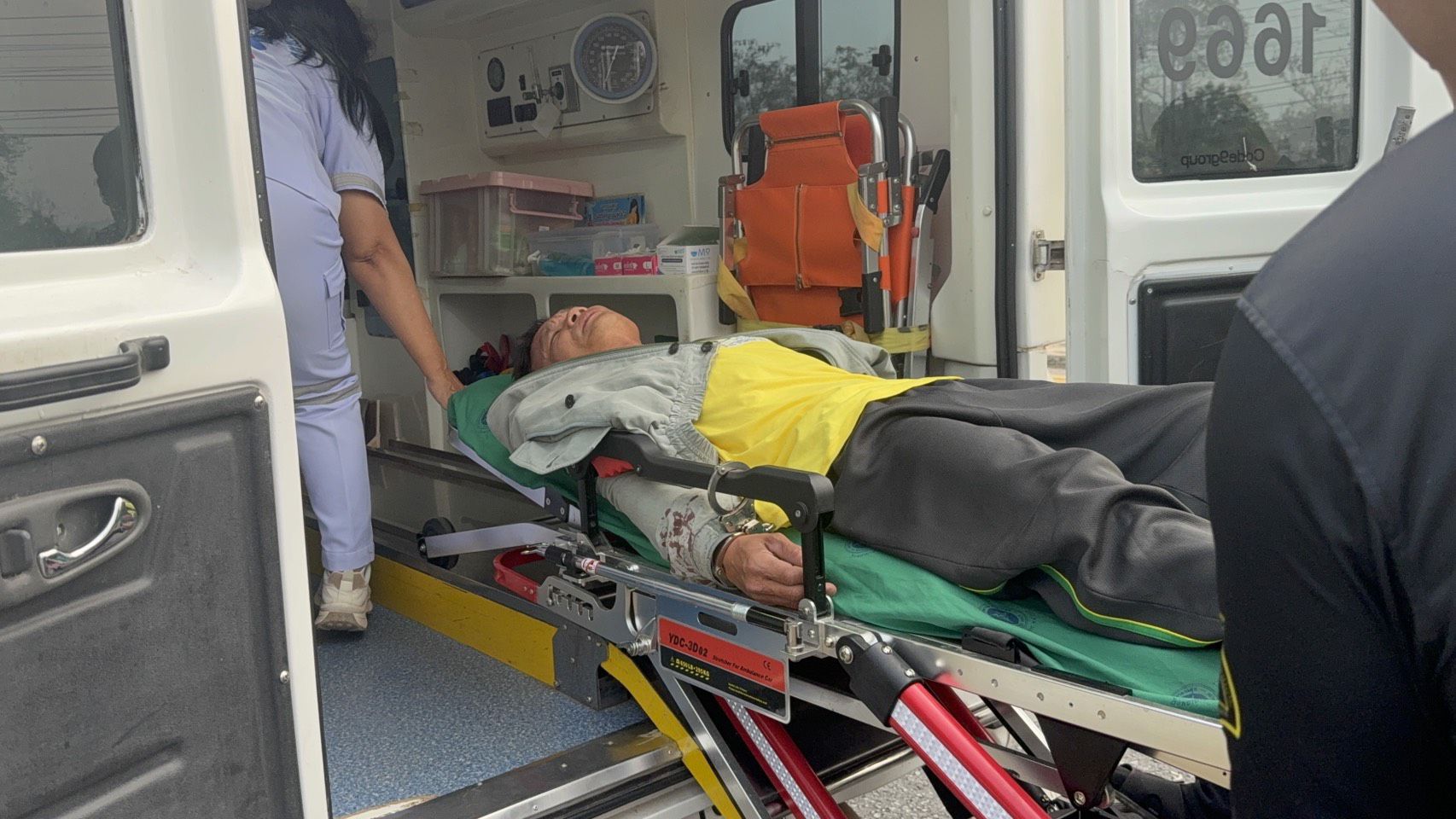 ก่อนนำตัวส่งโรงพยาบาลเพื่อรักษาอาการบาดเจ็บ ภายใต้การดูแลอย่างใกล้ชิดของเจ้าหน้าที่