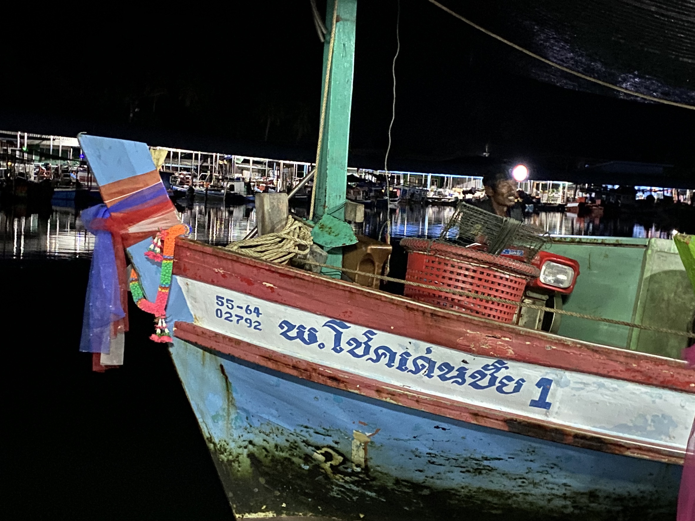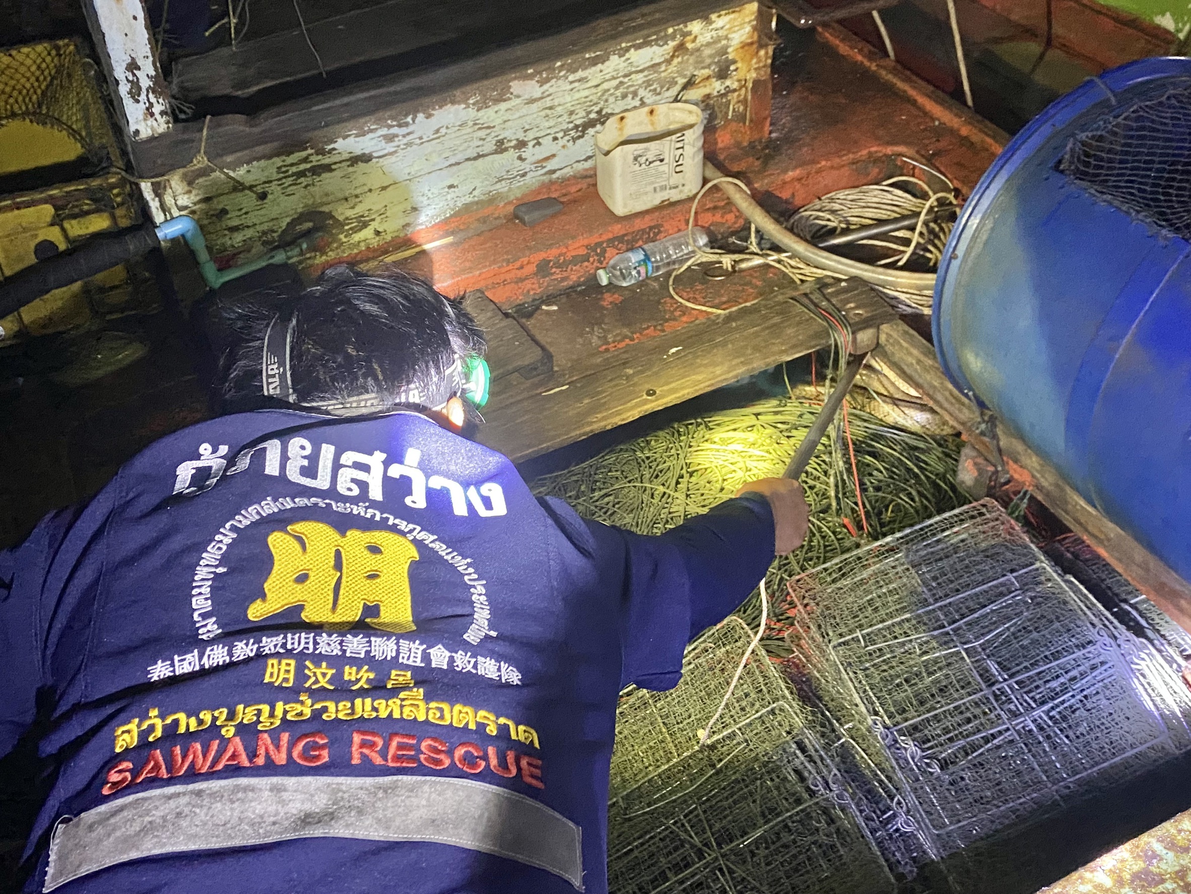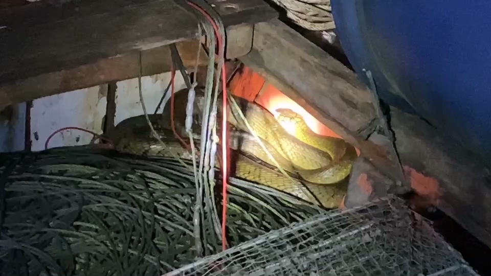 เลื้อยเข้าไปซุกตัวอยู่ในห้องเก็บอุปกรณ์ดักลอบและอวน ภายในเรือประมงพื้นบ้าน