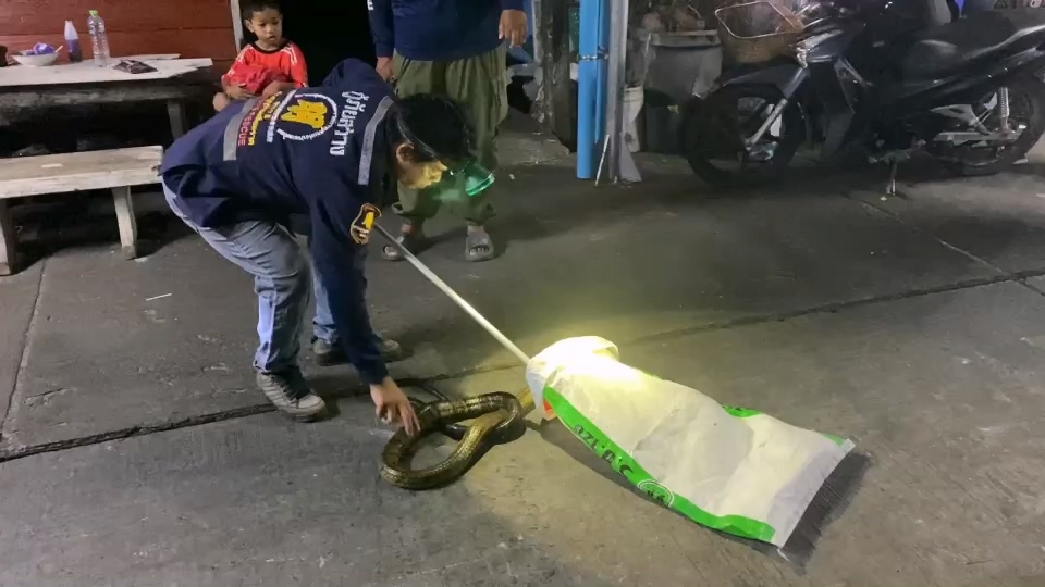 เจ้าหน้าที่จึงใช้อุปกรณ์จับงูเข้าดำเนินการอย่างระมัดระวัง ใช้เวลาประมาณ 10 นาที