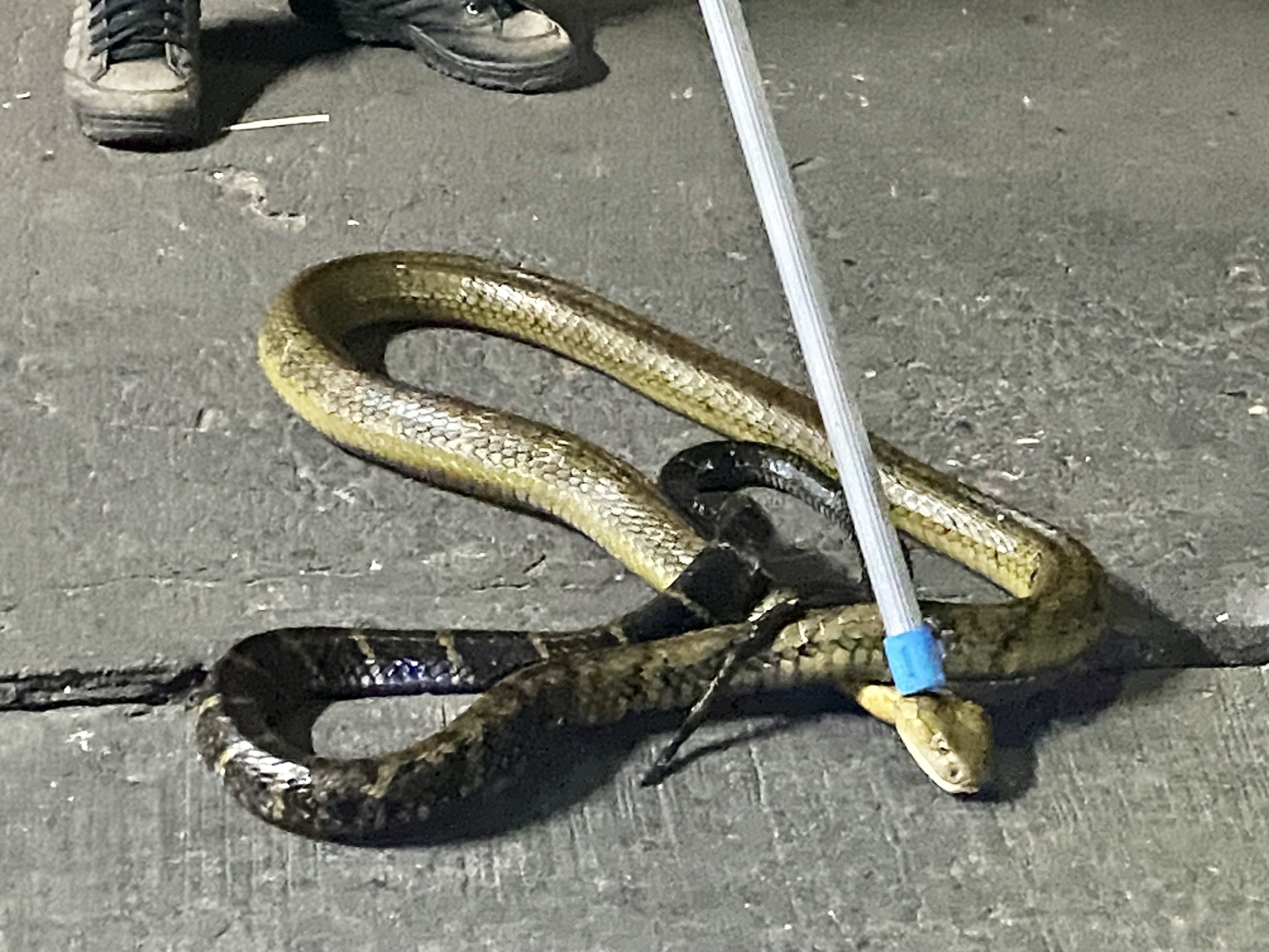 จึงสามารถจับงูออกมาจากท้องเรือได้ และใช้เวลาอีกประมาณ 5 นาที ในการจับใส่กระสอบ เนื่องจากงูมีขนาดใหญ่ ต้องใช้ถุงปุ๋ยถึง 2–3 ใบ เพื่อความปลอดภัย