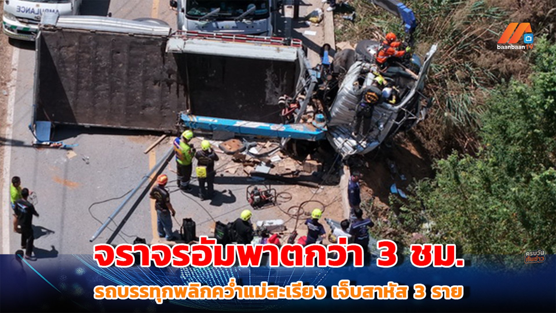 รถบรรทุกพลิกคว่ำแม่สะเรียง จราจรอัมพาตกว่า 3 ชม. เจ็บสาหัส 3 ราย