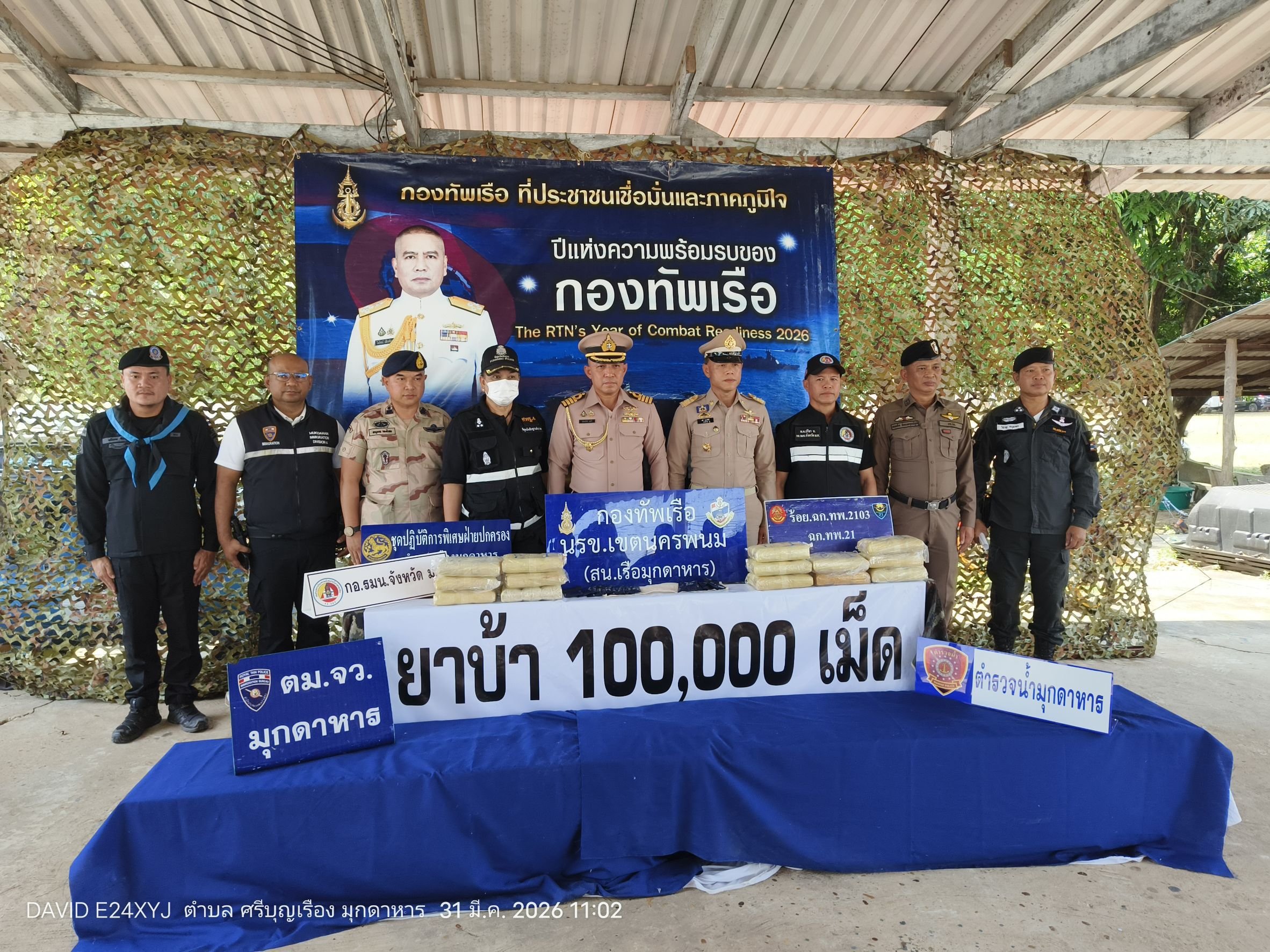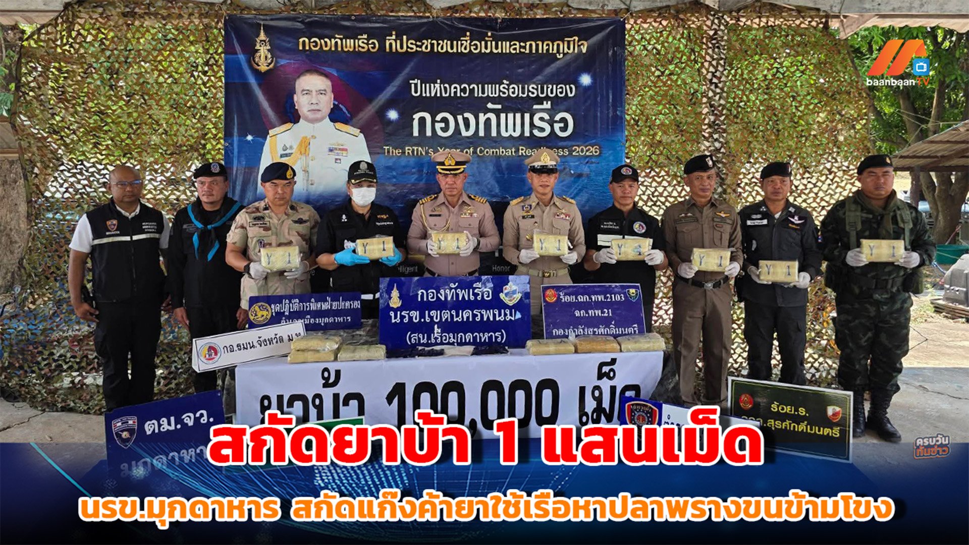 แถลงผลการตรวจยึดยาบ้า จำนวน 100,000 เม็ด ภายหลังสกัดกั้นขบวนการลักลอบลำเลียงยาเสพติดข้ามชาติในพื้นที่จังหวัดมุกดาหาร
