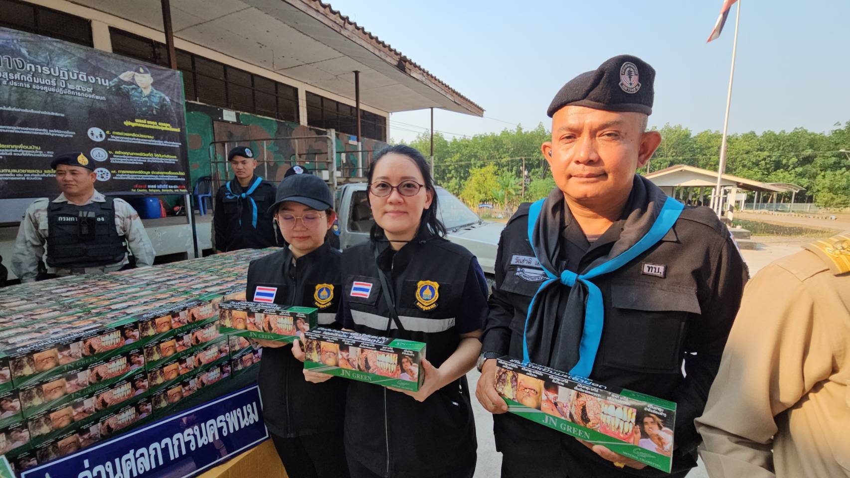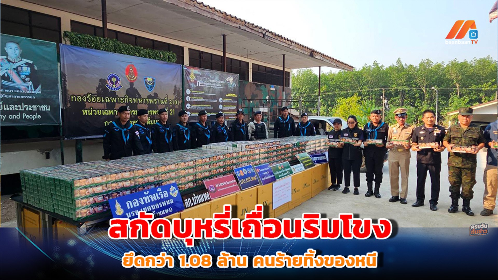 หน่วยงานความมั่นคงในจังหวัดนครพนม สนธิกำลังแถลงผลการตรวจยึดบุหรี่ลักลอบหนีภาษีล็อตใหญ่ บริเวณชายแดนแม่น้ำโขง พื้นที่อำเภอบ้านแพง
