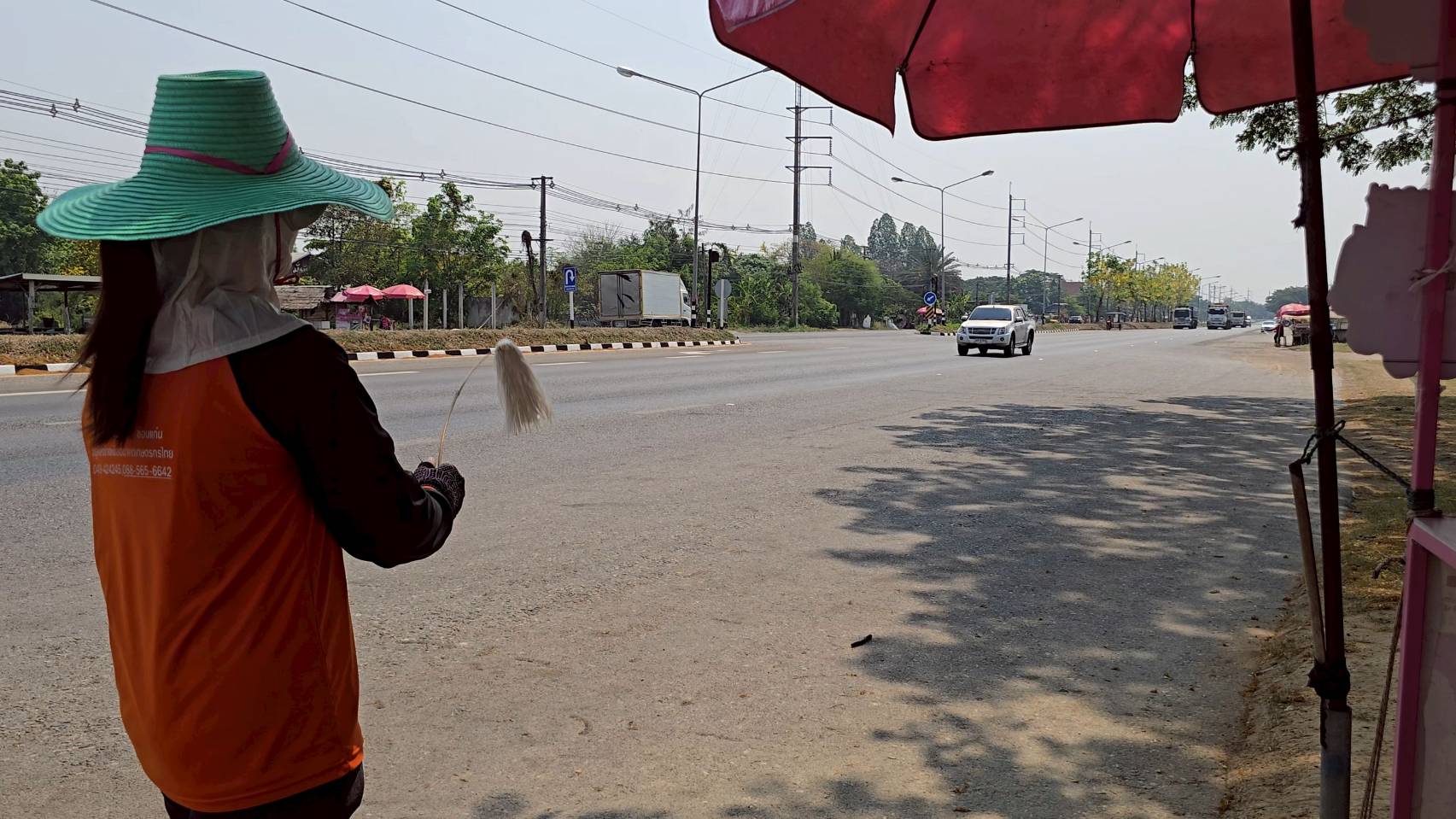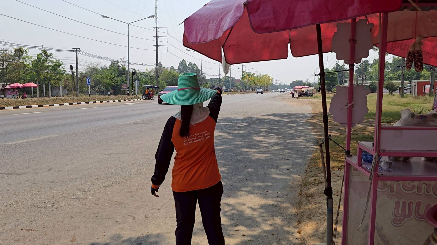 คือการโบกมือและโยกตัวเรียกลูกค้าอย่างต่อเนื่อง แม้ต้องเผชิญกับสภาพอากาศที่ร้อนจัดตลอดทั้งวัน