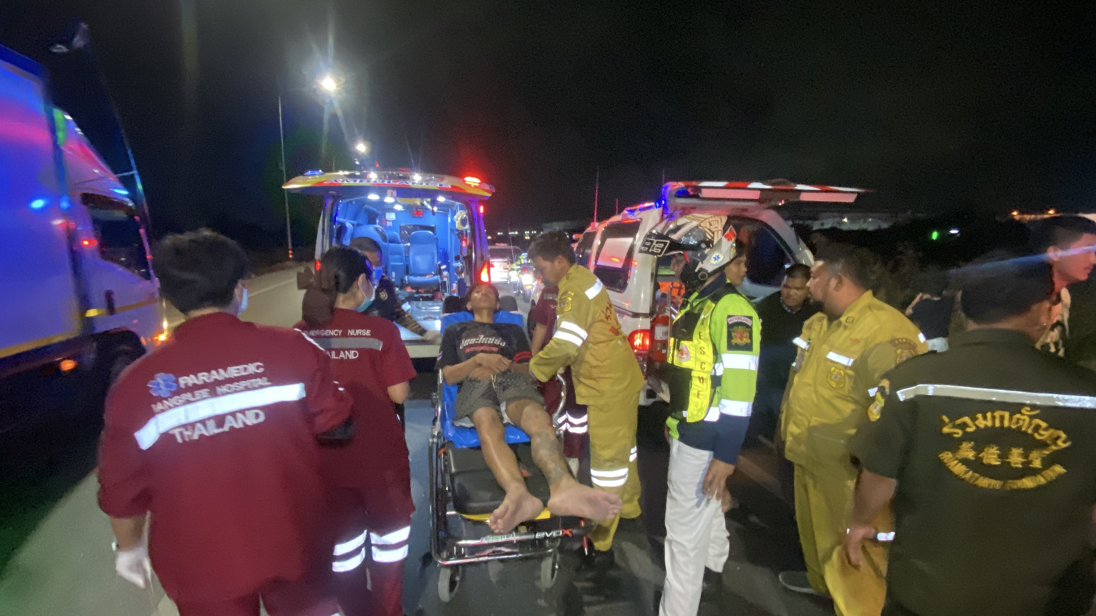 ถนนเลียบคลองส่งน้ำสุวรรณภูมิ ตำบลบางปลา จ.สมุทรปราการ หลังจากนั้น เจ้าหน้าที่กู้ชีพและมูลนิธิร่วมกตัญญูได้ช่วยเหลือผู้บาดเจ็บทั้งหมด 4 คน