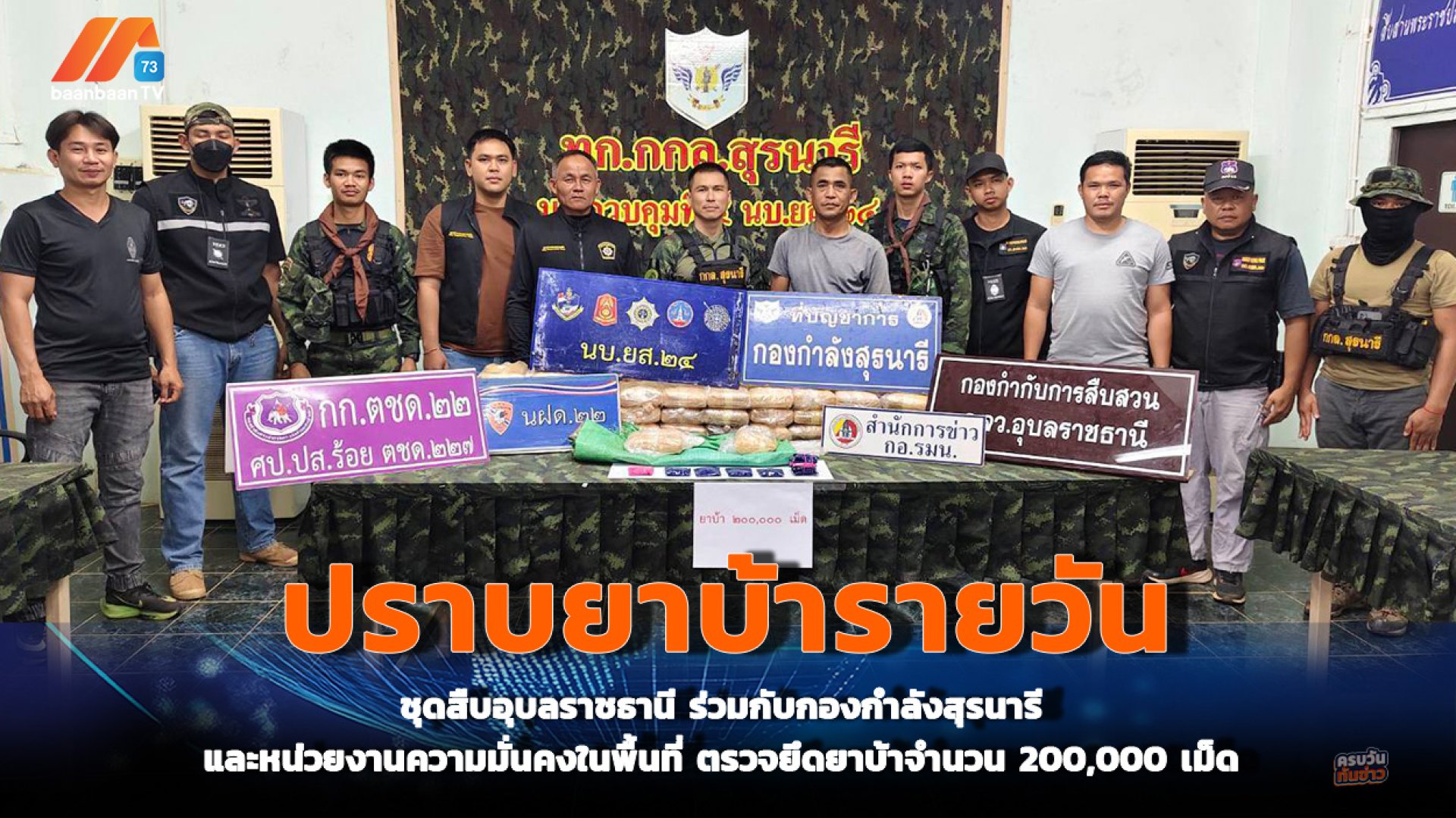ร่วมกับทหารจากกองกำลังสุรนารี และหน่วยงานความมั่นคงในพื้นที่ ตรวจยึดยาบ้าจำนวน 200,000 เม็ด