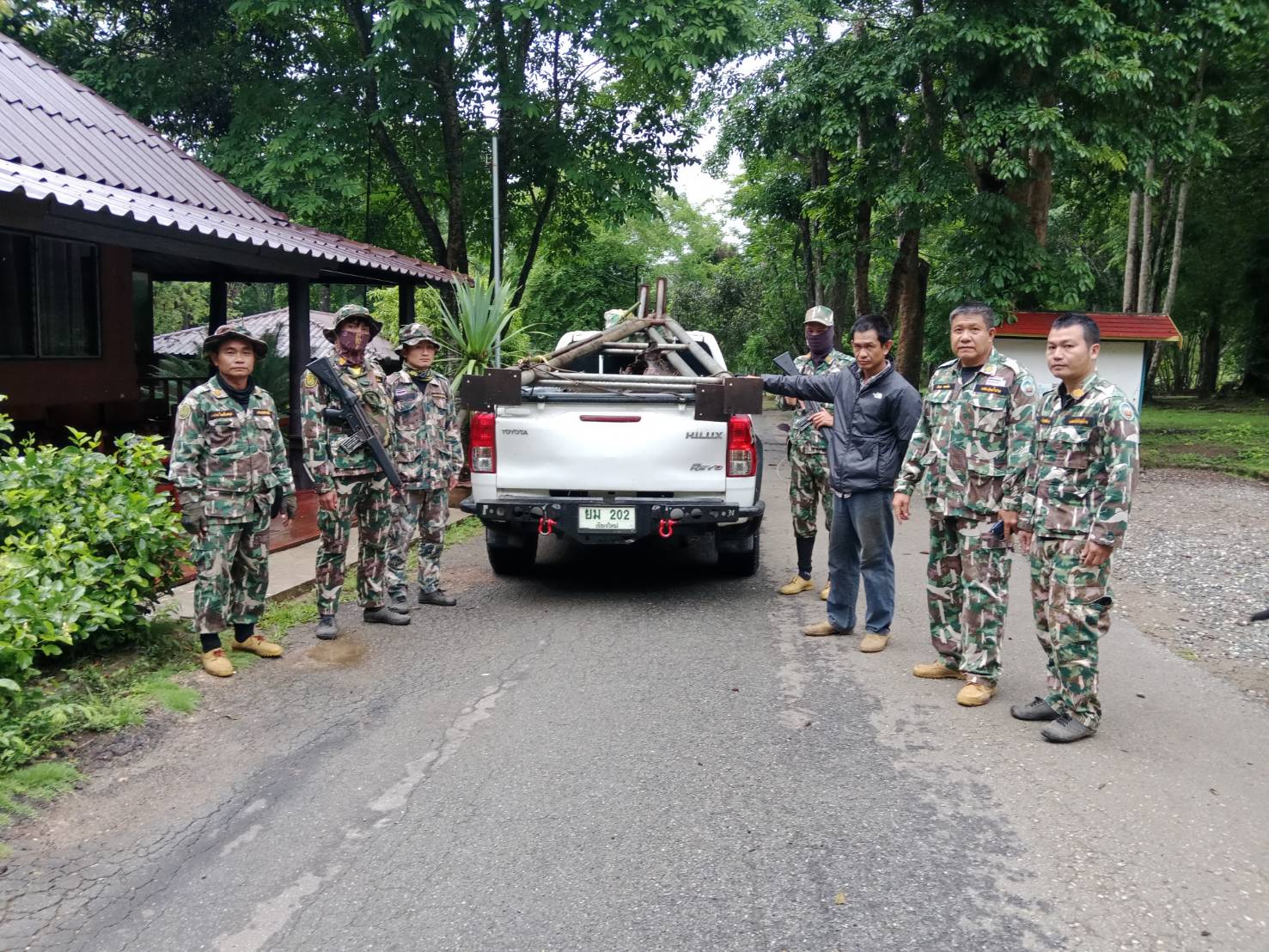 จากการตรวจค้น พบเลื่อยวงเดือน ไม้ท่อน และไม้แปรรูปจำนวนมาก รวมปริมาตรไม้หวงห้ามทั้งสิ้น 11.265 ลูกบาศก์เมตร
