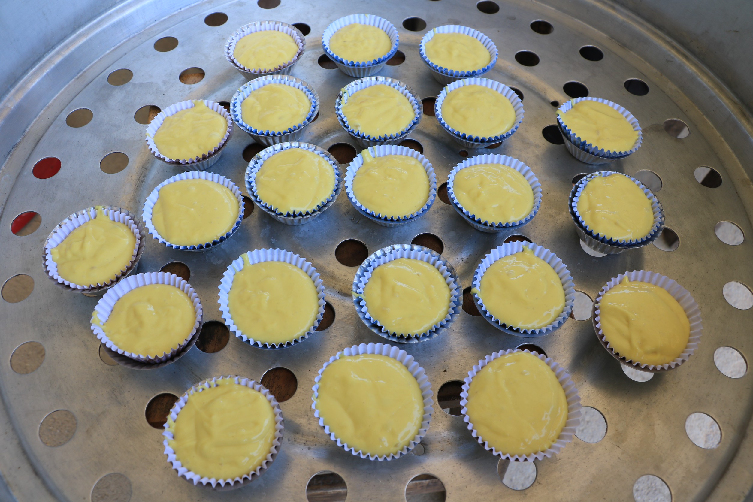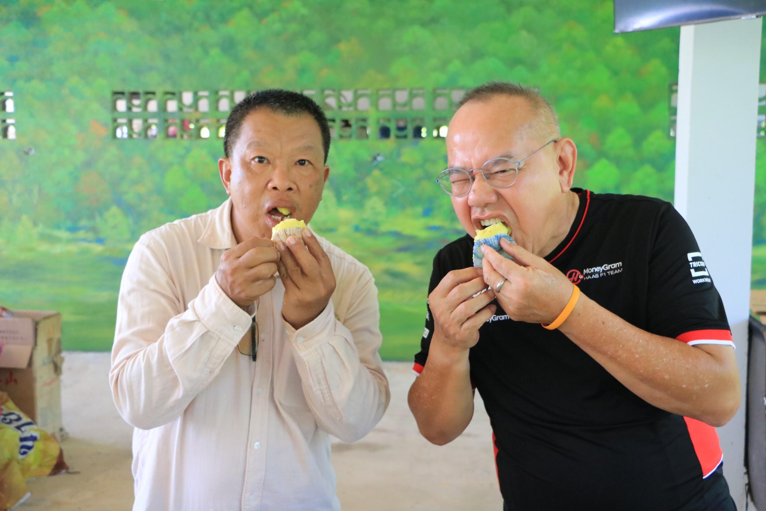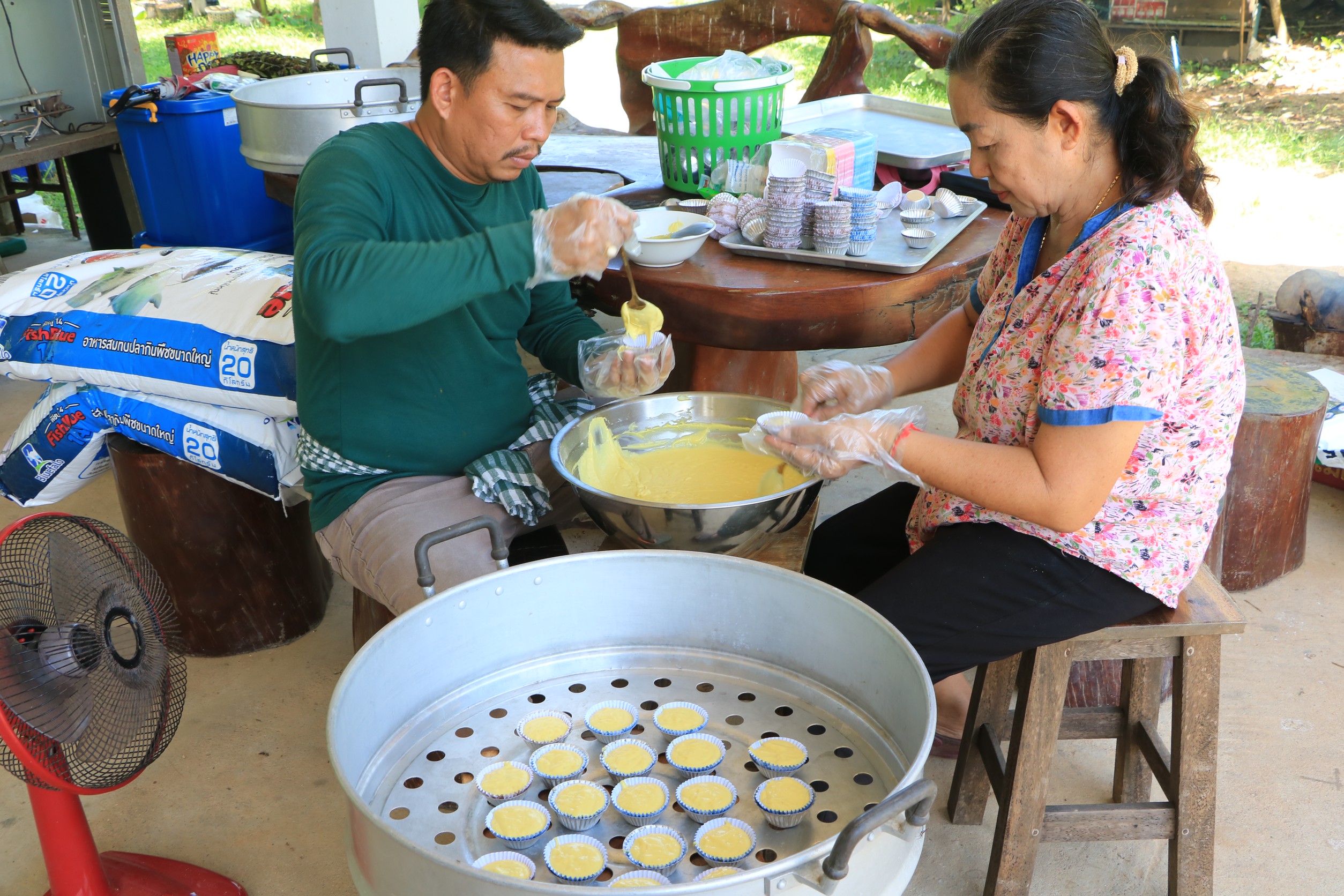 ไม่สามารถขายเป็นผลสดได้ เลยลองนำเนื้อทุเรียนมูซานคิงมาแปรรูปเป็นขนมถ้วยฟู ซึ่งเมื่อทำออกมาแล้วพบว่ามีสีสันสวยงาม รสชาติอร่อยจริง