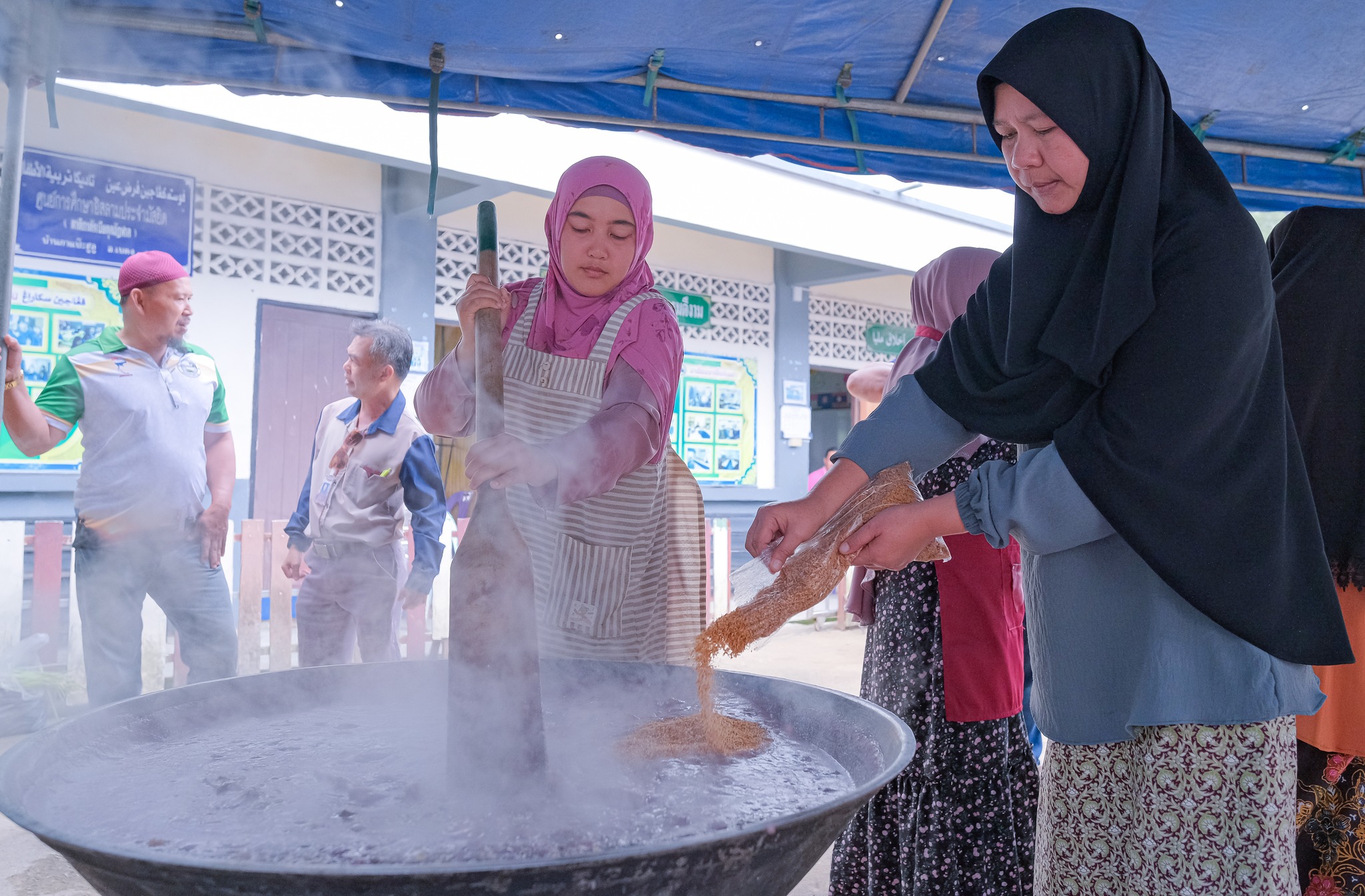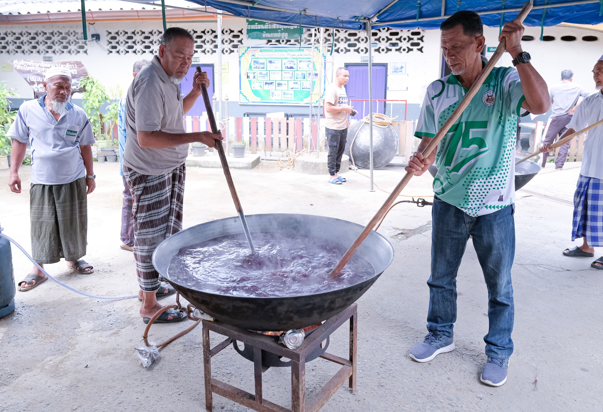 บรรยากาศเป็นไปอย่างอบอุ่นและคึกคัก ทุกคนร่วมแรงร่วมใจกันตั้งแต่เตรียมวัตถุดิบจนถึงกวนขนมอาซูรอในกระทะใหญ่
