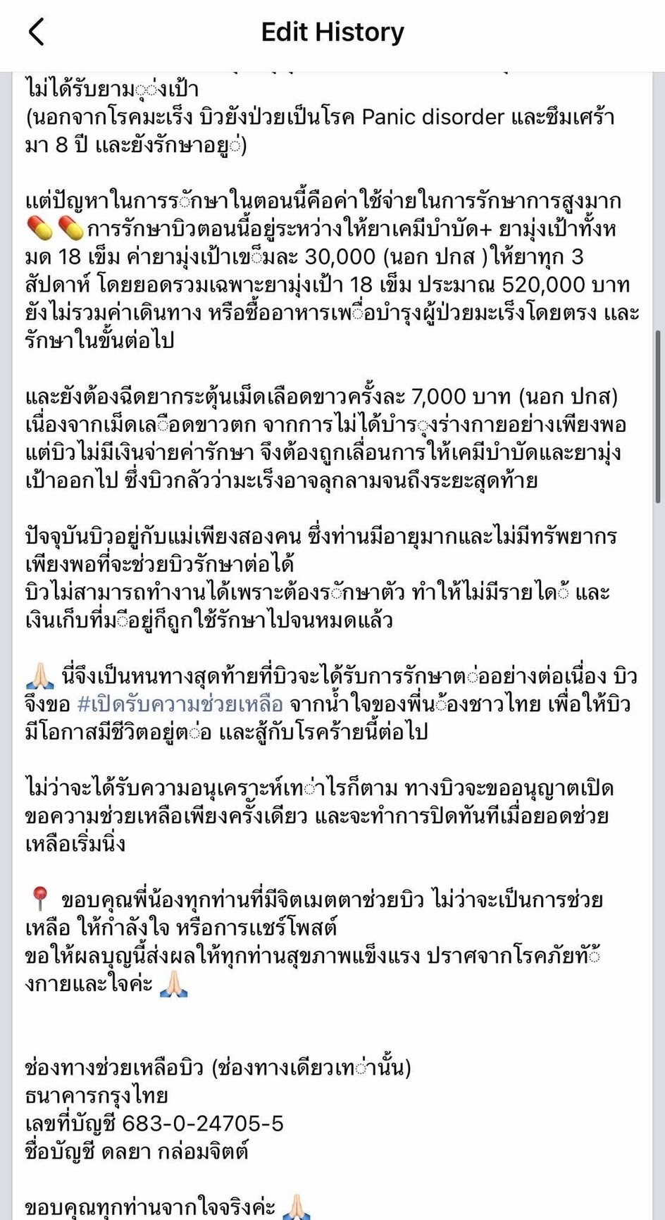 กรณีหญิงรายหนึ่งโพสต์เฟซบุ๊กอ้างป่วยมะเร็งเต้านมระยะ 3 ขอรับบริจาคค่ารักษา ระบุค่ายาเคมีบำบัดและยามุ่งเป้ารวมกว่า 5 แสนบาท