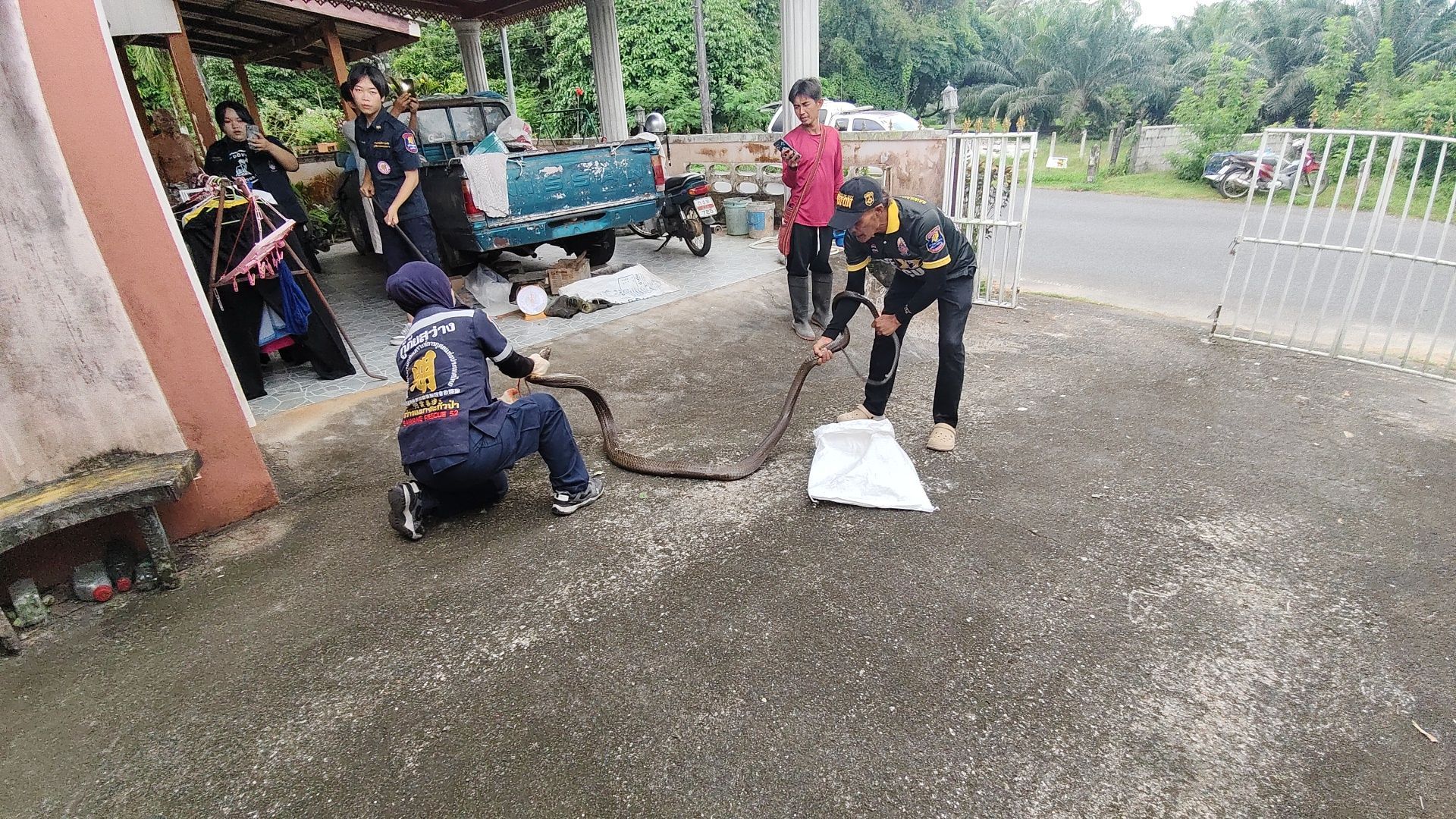 ขนาดใหญ่นอนอยู่ใต้ตู้ภายในบ้าน โดยเจ้าหน้าที่กู้ภัยสว่างเมฆาธรรมสถานอำเภอตะกั่วป่า