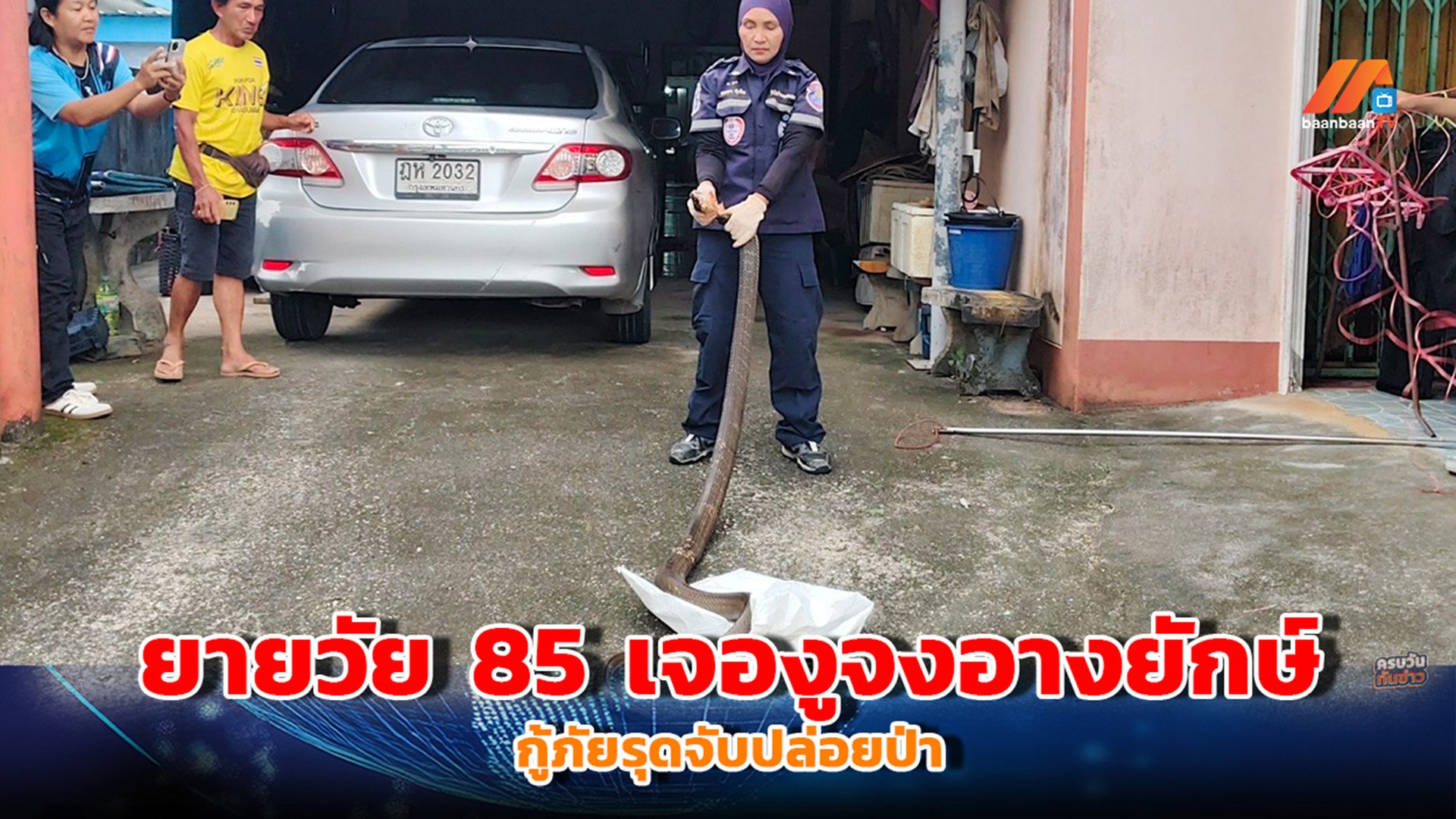 ยายวัย 85 เจองูจงอางยักษ์ 4 เมตรใต้ตู้เสื้อผ้า กู้ภัยรุดจับปล่อยป่า