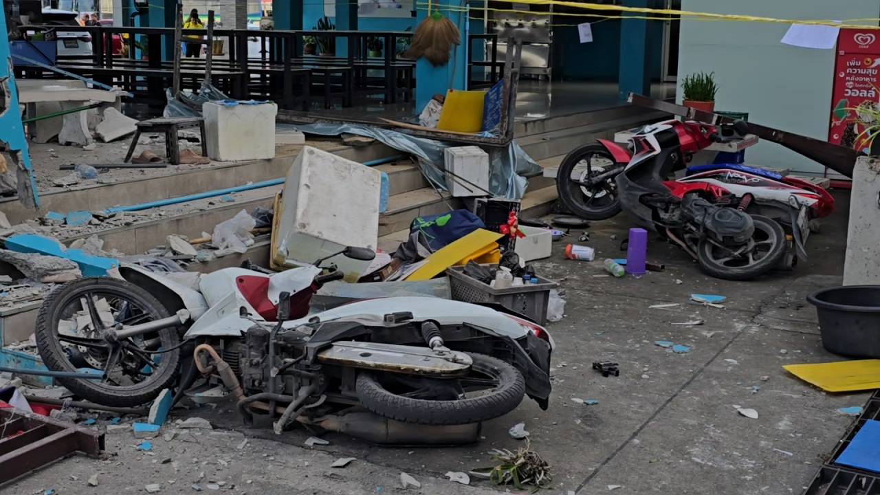 ความเสียหายรวมรั้วพังยาว 4 เมตร เสาอาคารหัก 1 ต้น ตัวรถค้ำโครงสร้างจนไม่สามารถเคลื่อนย้ายได้ เสี่ยงอาคารถล่ม
