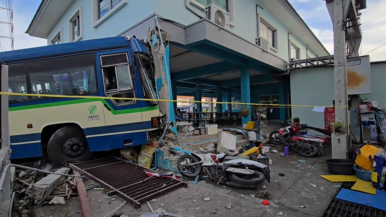 รถเมล์พุ่งชนกำแพงอู่ คนขับตกใจประตูฝั่งคนขับเปิดเองกะทันหัน