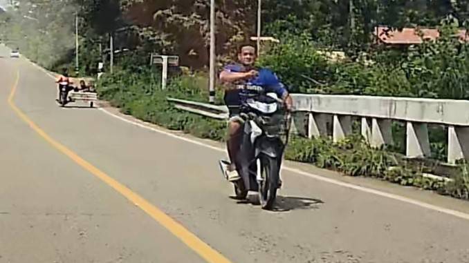 เกิดเหตุชายสวมเสื้อแขนยาวสีฟ้า กางเกงขาสั้นสีขาว ขับรถจักรยานยนต์สีเทาดำ ขว้างถุงบรรจุตะปูใส่รถกู้ชีพโรงพยาบาลกบินทร์บุรี