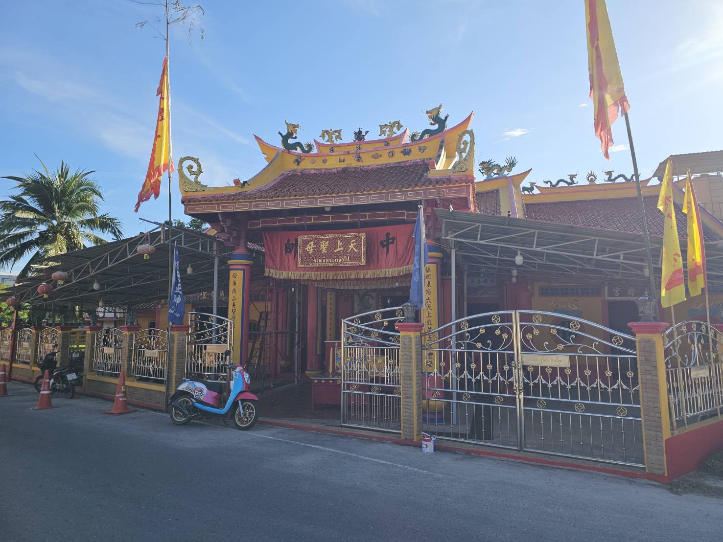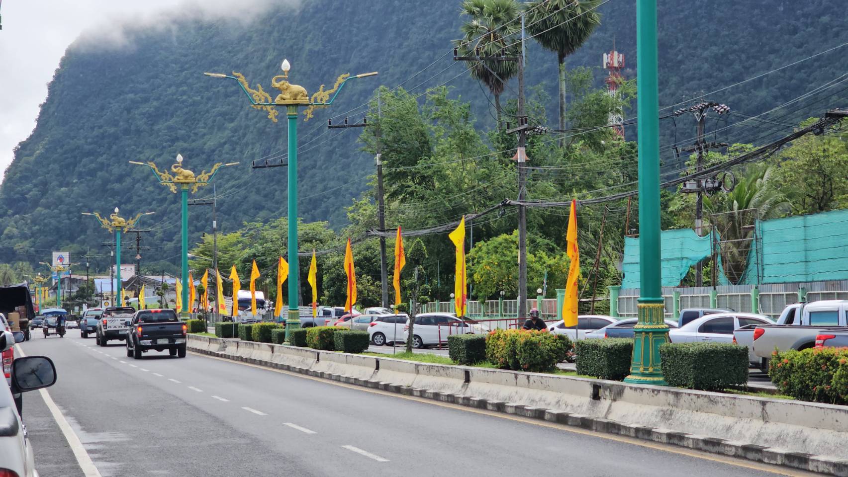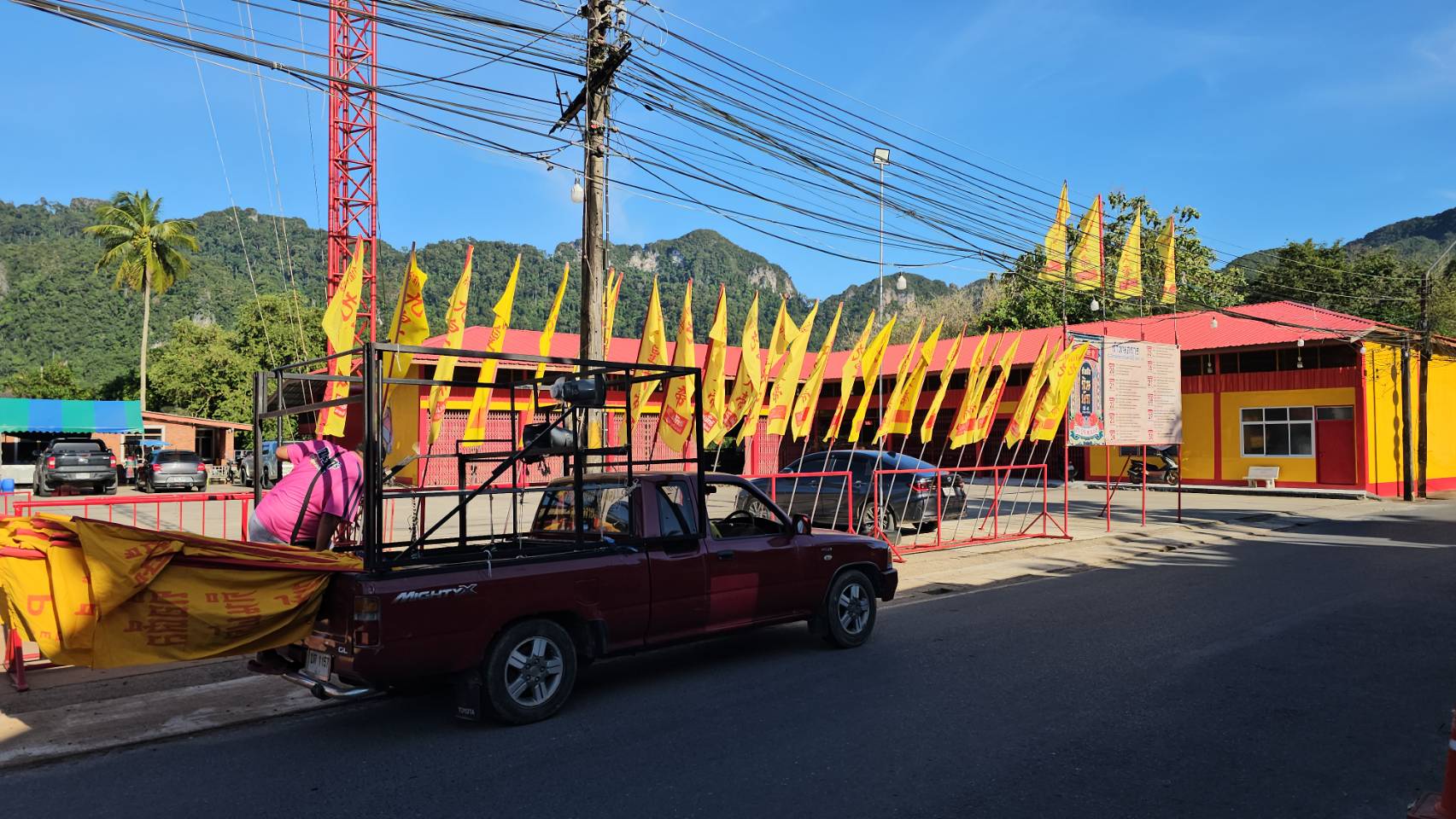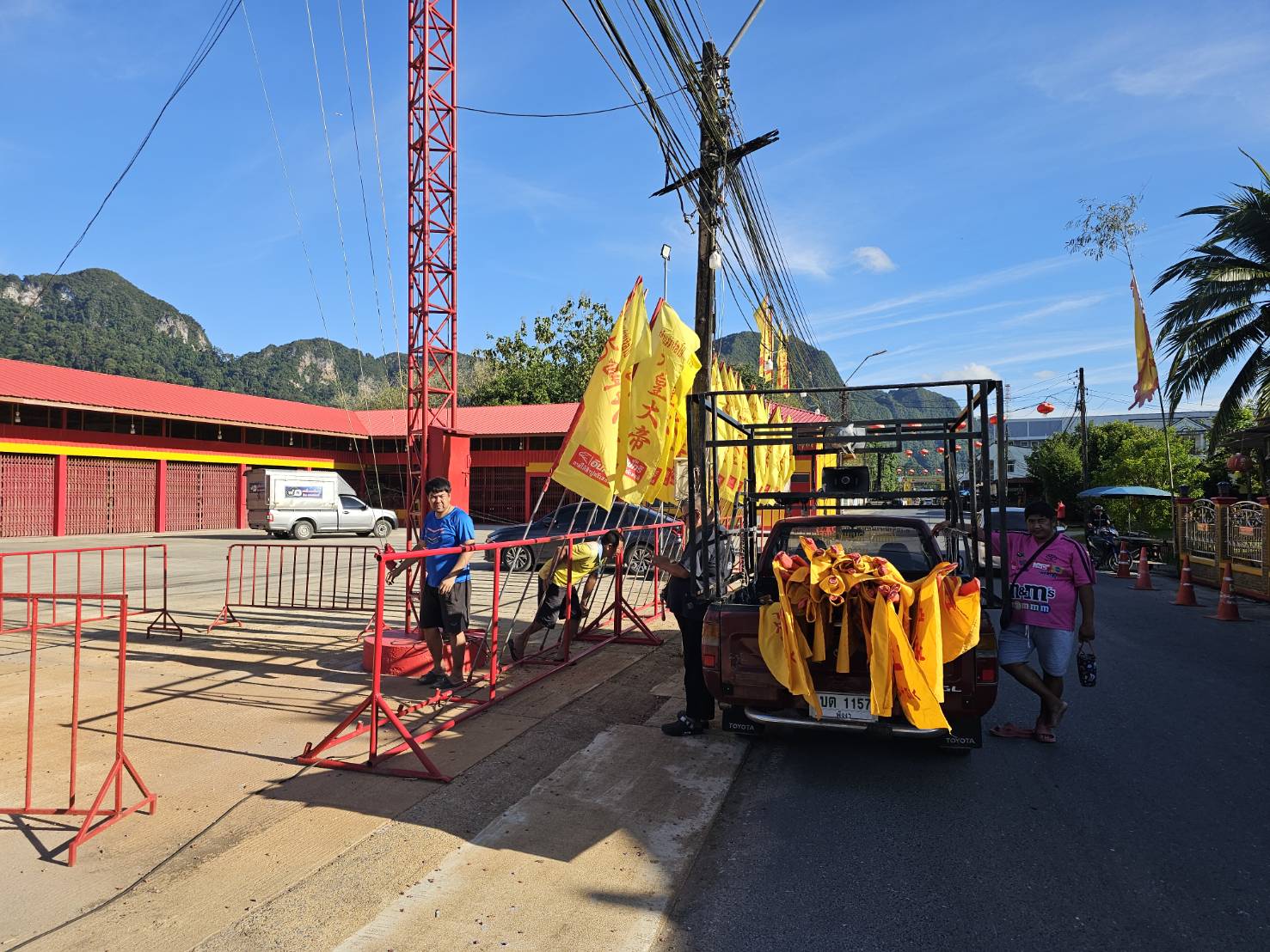 ชาวบ้านและศาลเจ้าต่างประดับธงเหลืองตลอดแนวถนน เพื่อเตรียมต้อนรับเทศกาลถือศีลกินผัก ประจำปี 2568