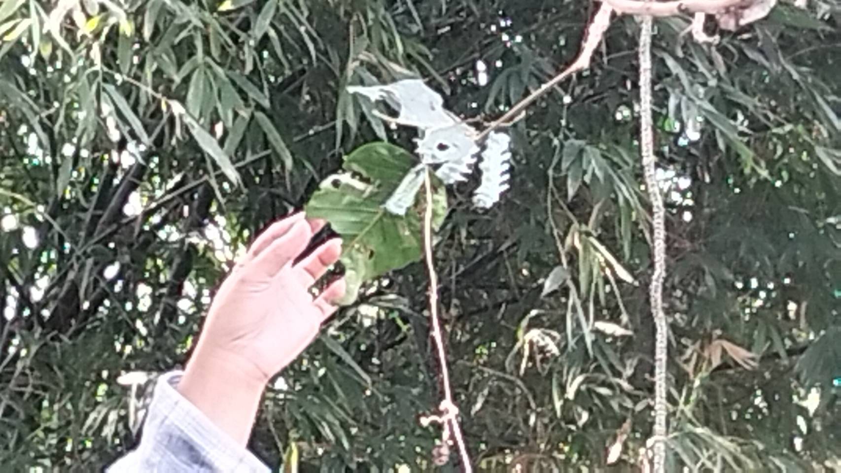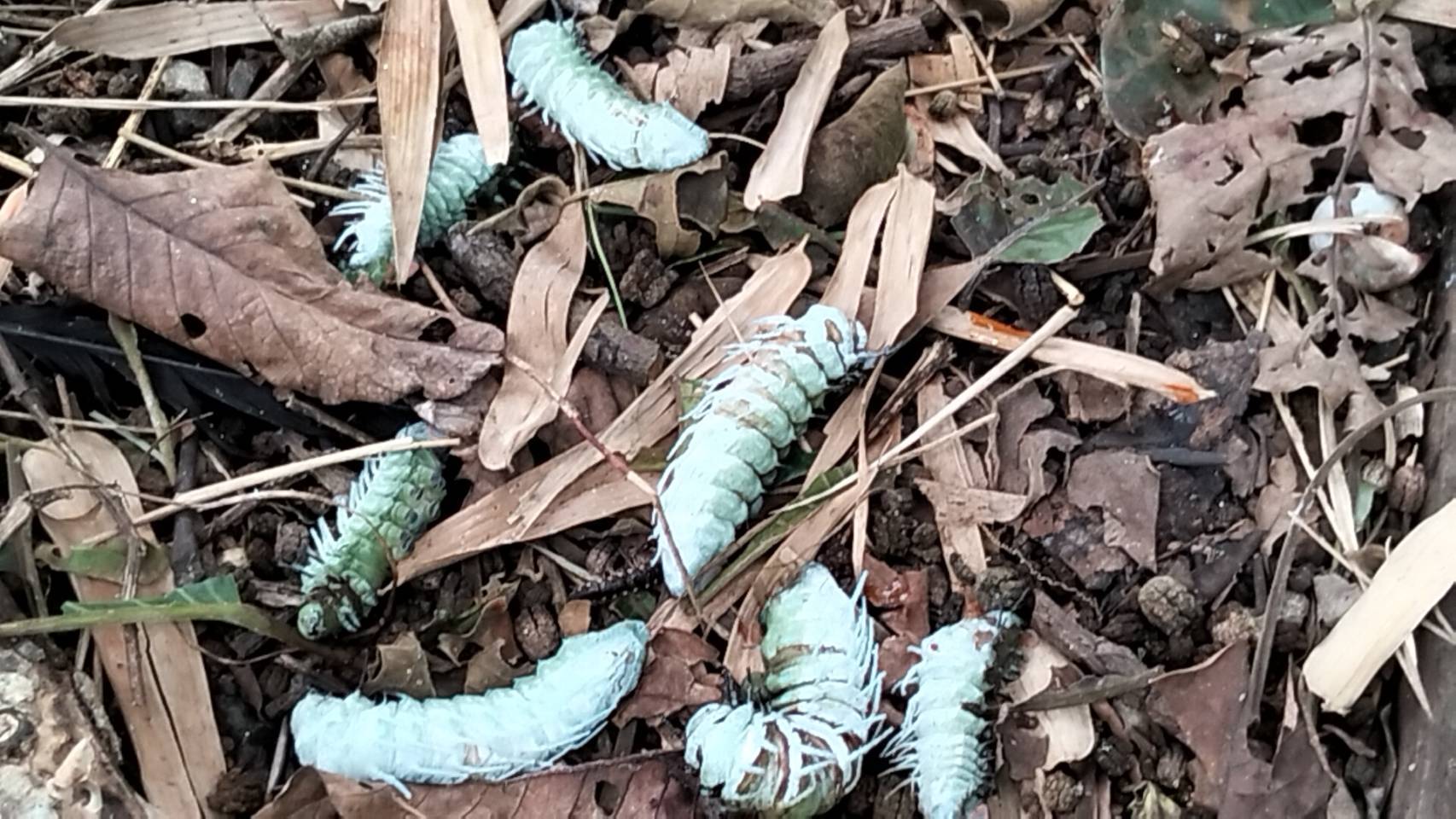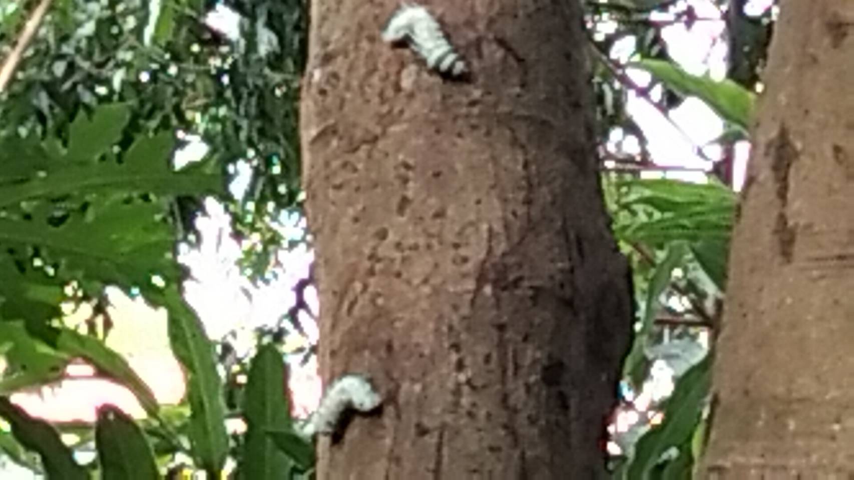 แต่ช่วงบ่ายพบหนอนสีฟ้าตัวใหญ่เท่านิ้วมือไต่เต็มกิ่งไม้ บางตัวชักดิ้นชักงอหลังฉีดยาฆ่าแมลง