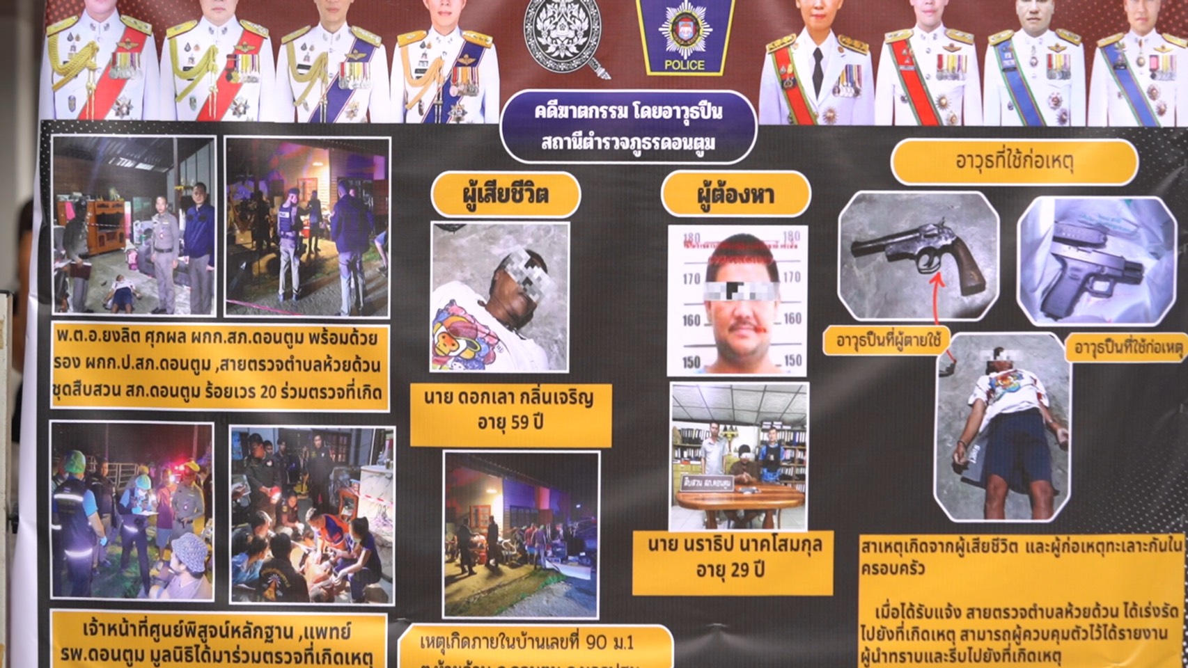 และคดีสุดท้าย จับกุม นายนราธิป นาคโสมกุล อายุ 29 ปี ลูกเขยที่ก่อเหตุยิงพ่อตาเสียชีวิตภายในบ้านพักที่อำเภอดอนตูม สาเหตุจากความขัดแย้งในครอบครัว