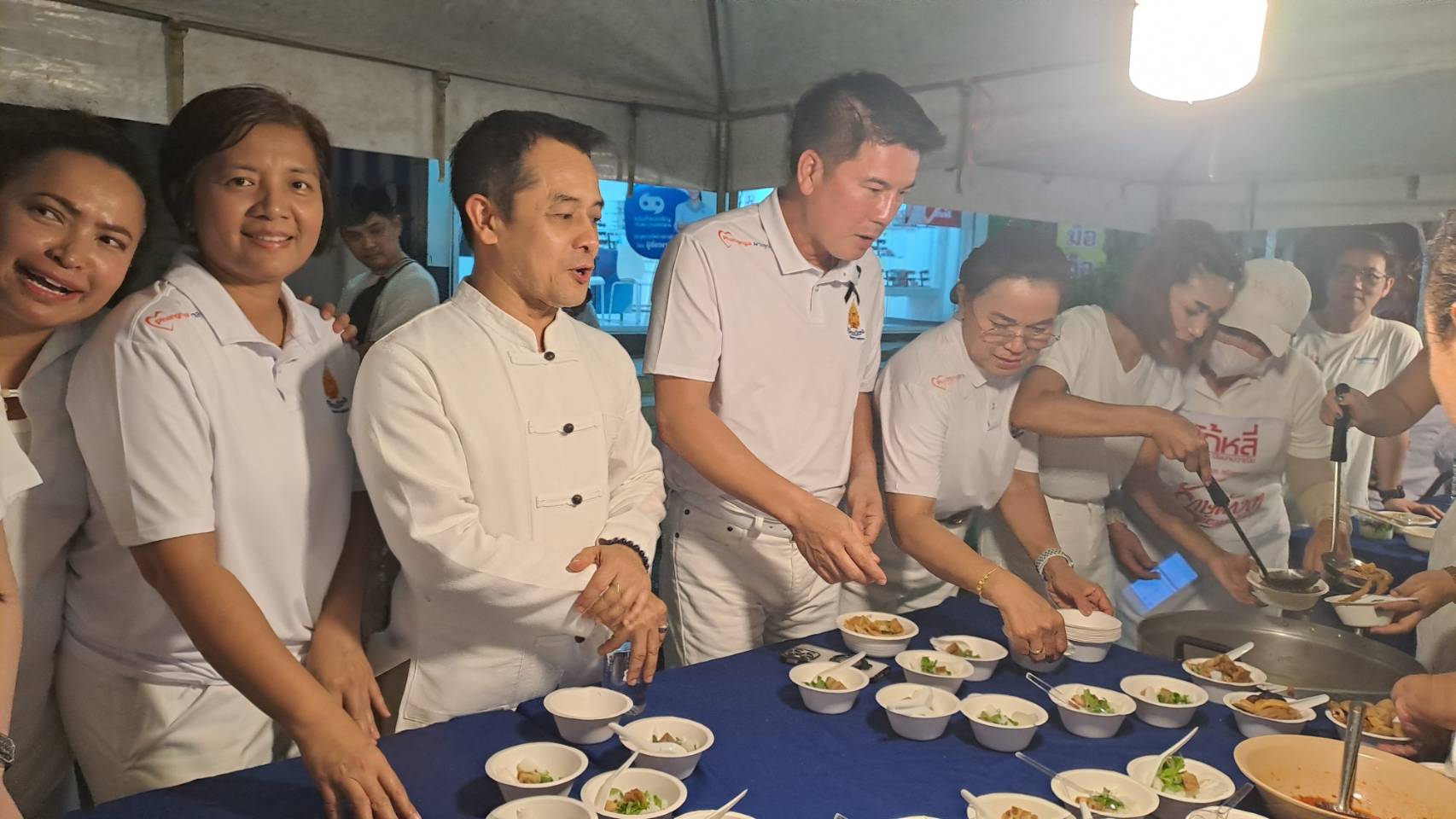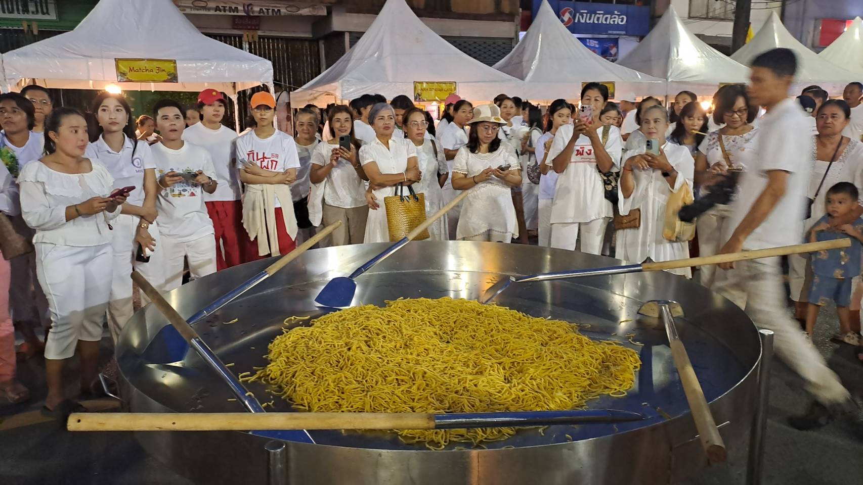 พร้อมร่วมผัดหมี่มงคลกระทะยักษ์แจกประชาชน โดยบรรยากาศภายในงานคึกคัก ผู้ร่วมงานสวมใส่ชุดขาวเข้าร่วมหลายพันคนทั่วตลาด