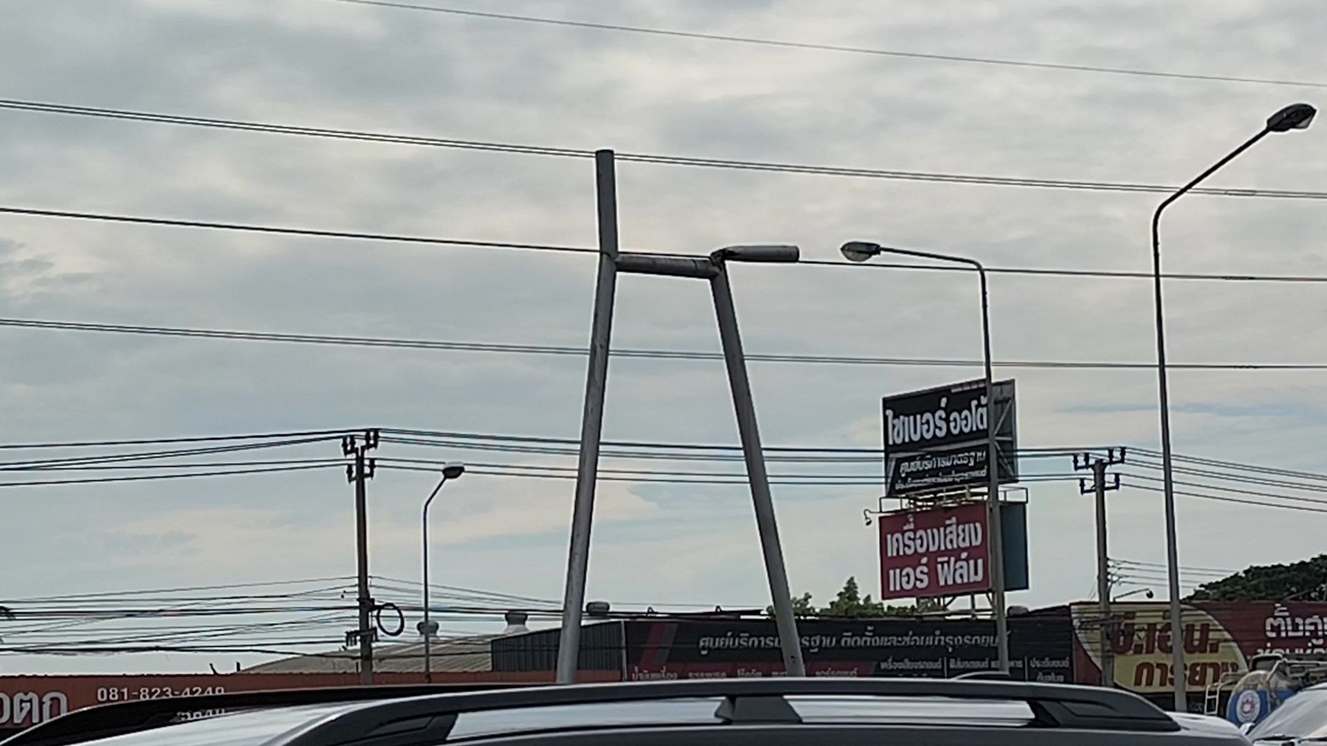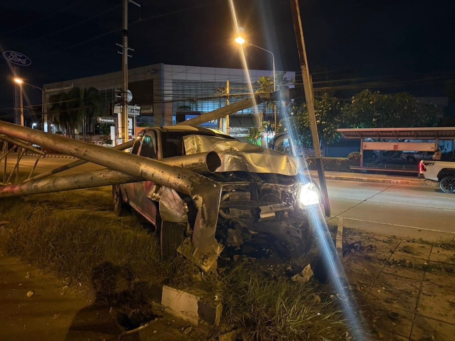 เกิดเหตุรถกระบะอีซูซุ สีบรอนซ์เงิน ทะเบียน ถฐ 2004 กทม. พุ่งชนเสาป้ายบอกทางขนาดใหญ่หน้าโชว์รูมฟอร์ด