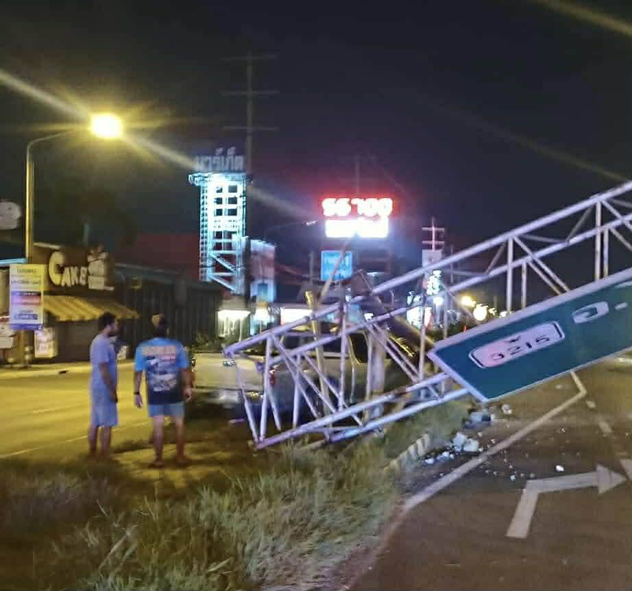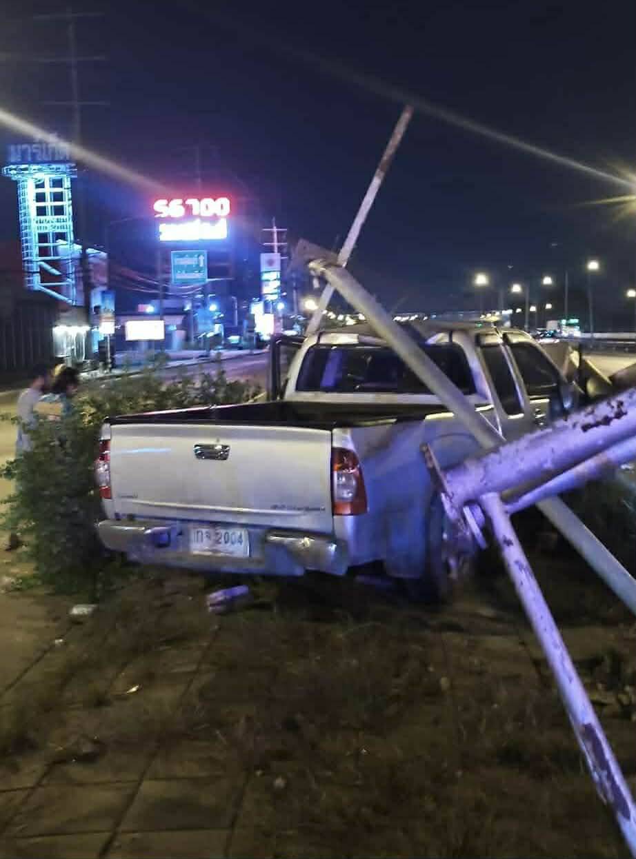 รถกระบะพุ่งชนเสาป้ายบอกทางล้มขวางถนน คนขับหนีหาย ตำรวจเร่งล่าตัว