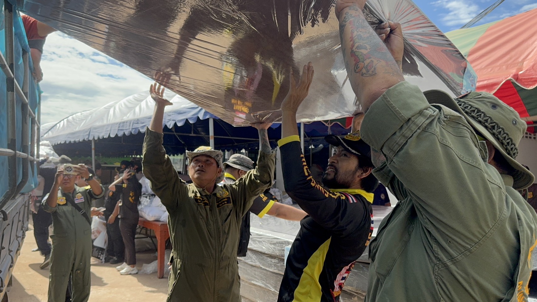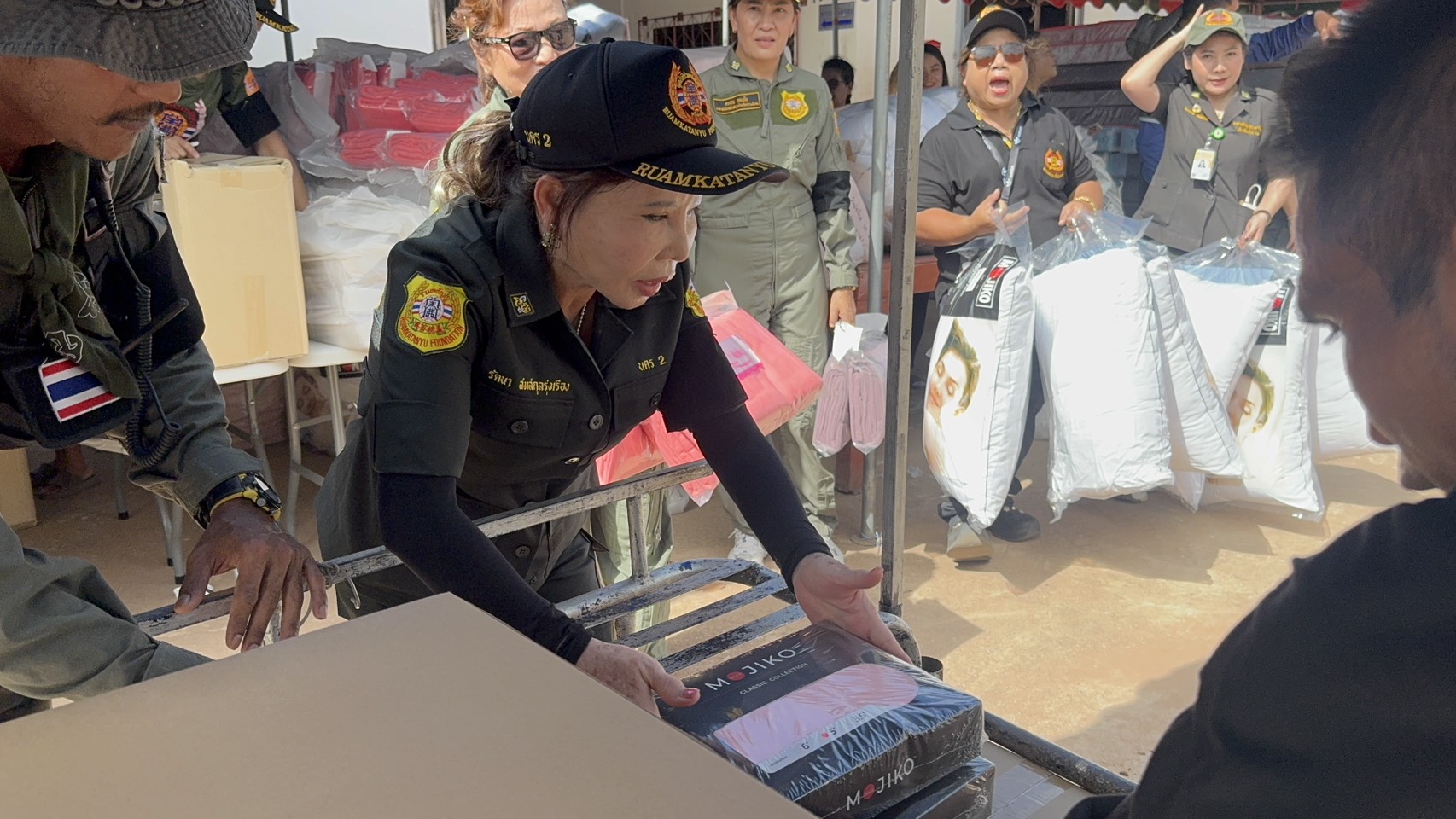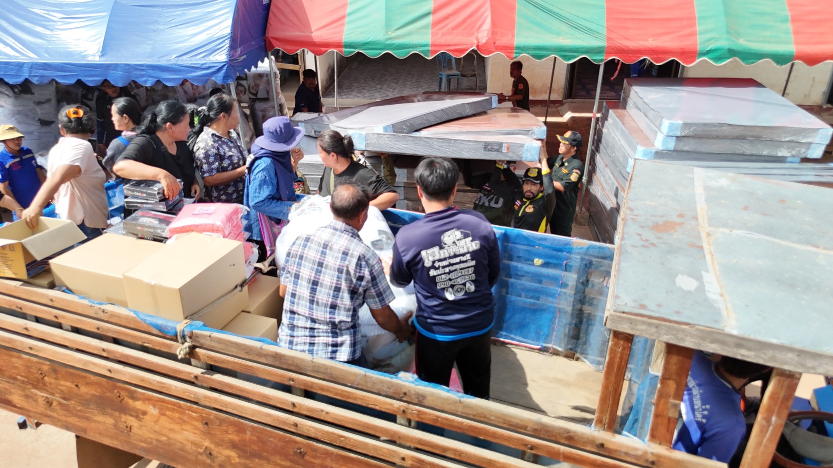 บิณฑ์ บรรลือฤทธิ์ พร้อมทีมมูลนิธิร่วมกตัญญู นำที่นอน หมอน ผ้าห่ม เตาแก๊ส หม้อหุงข้าว และกระติกน้ำร้อน