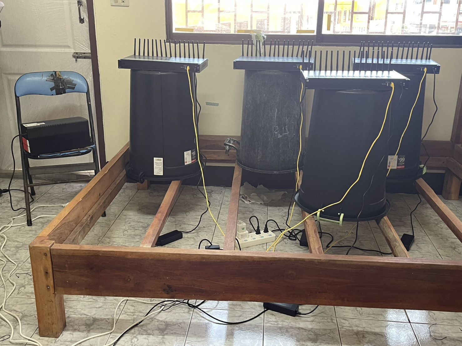 ภายในอาคารชั้น 2 พบเครื่องซิมบ็อกซ์ 4 เครื่อง วางบนถังน้ำพลาสติกสีดำ แต่ละเครื่องบรรจุซิมได้ 32 เบอร์