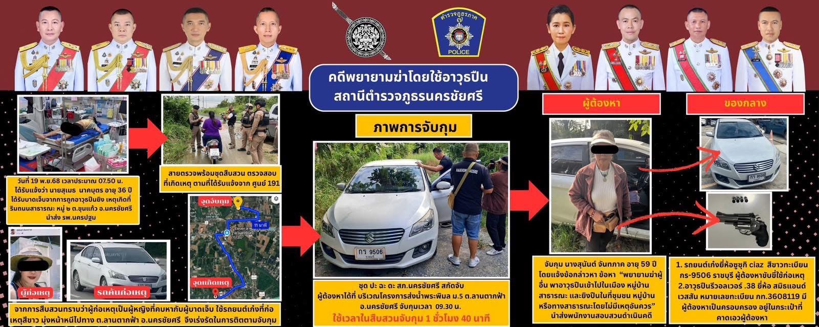 ตำรวจภูธรจังหวัดนครปฐมนำกำลังชุดสืบสวนจับกุม นางสุนันต์ จันทภาค อายุ 59 ปี ผู้ต้องหาคดีพยายามฆ่า